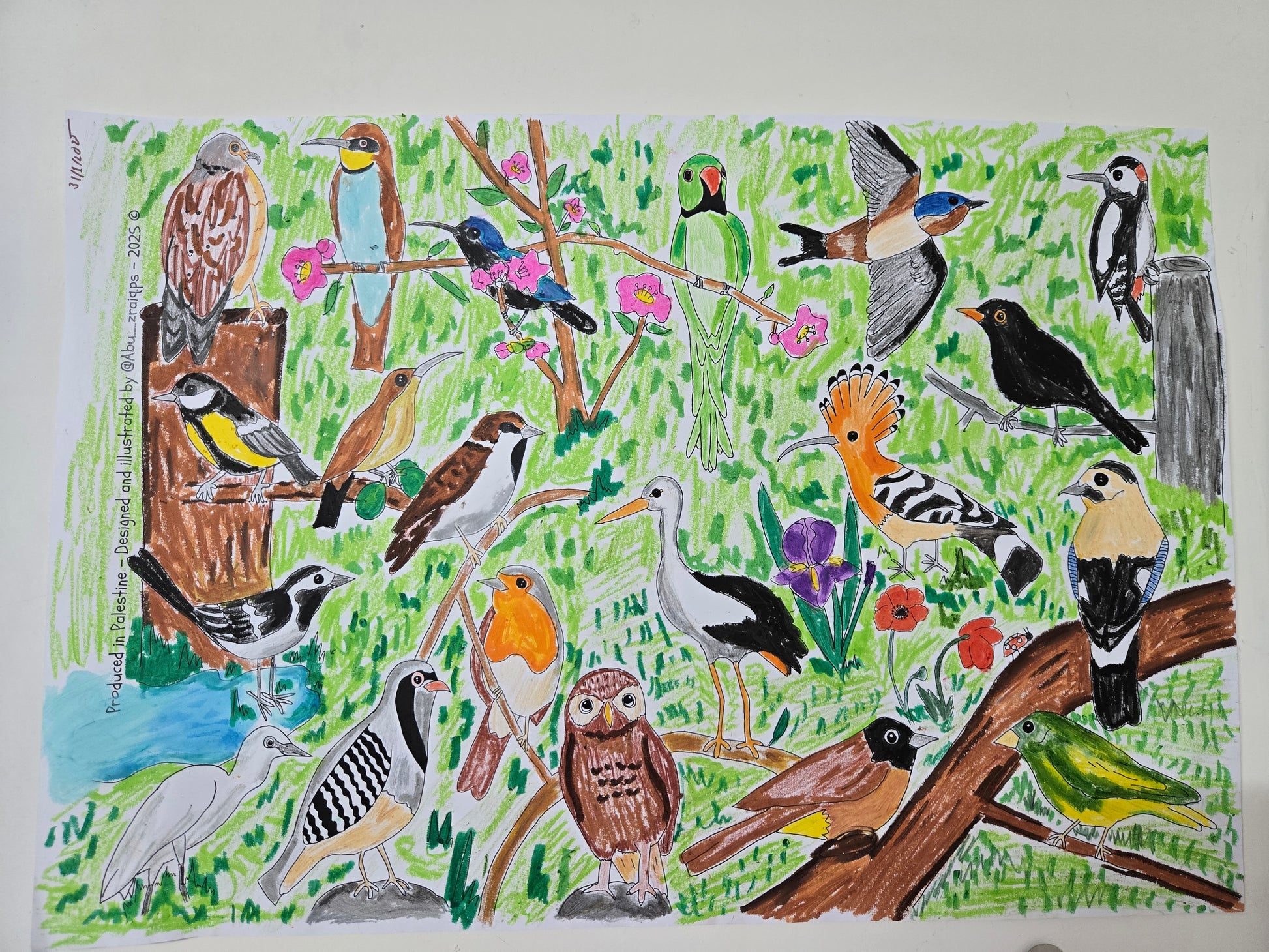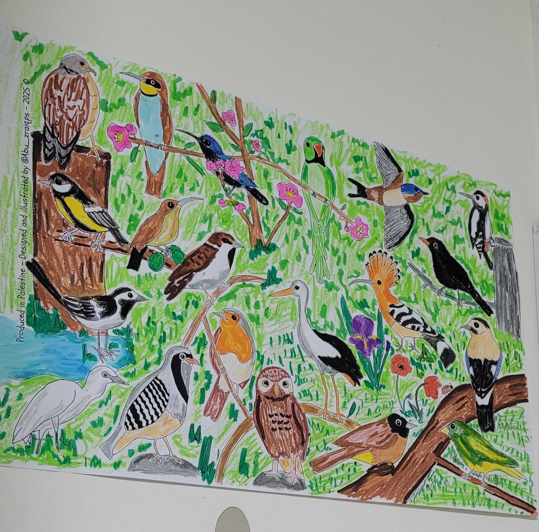 Abu Zraiq (the Eurasian jay) finds an opportunity in art to introduce his bird friends to you🖍🐦 This A2 color-in poster introduces 19 bird species present in Palestine 🇵🇸