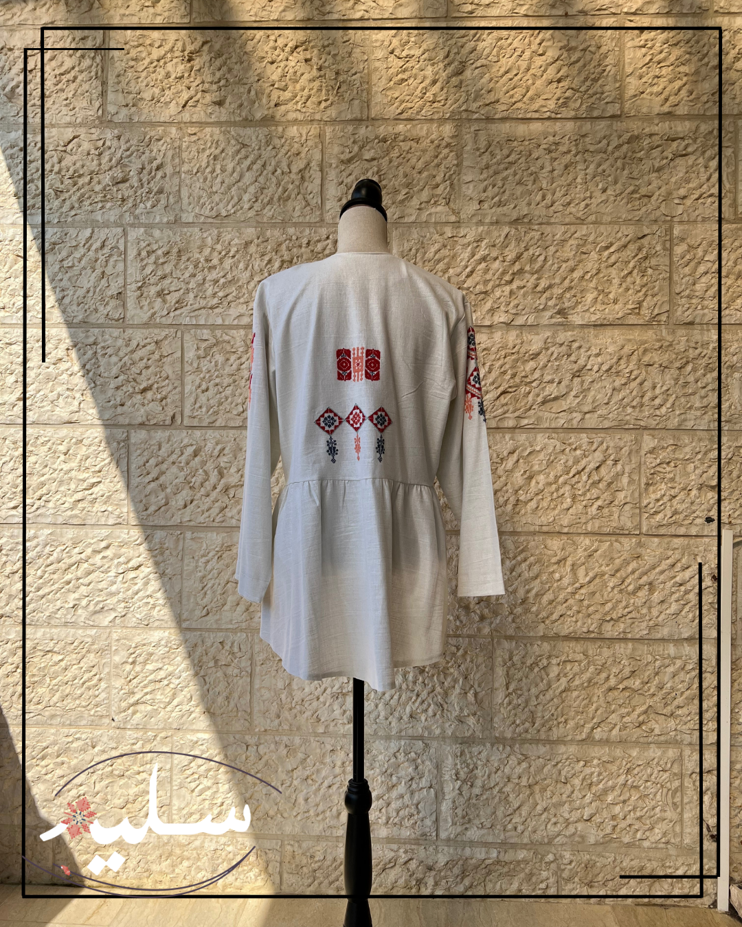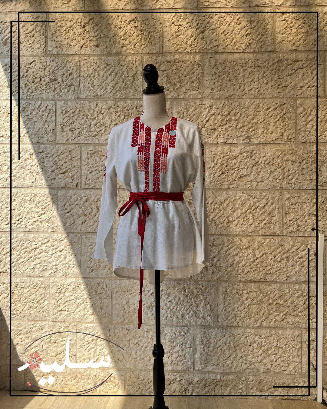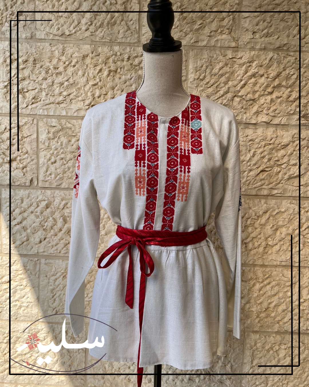 قميص من سليم عملي وراقي مريح لنهار الصيف الطويل. ️ قماشه لينين بارد أبيض مدمج بلمعان فضي خفيف. العروق المطرزة بالأحمر الغالب تجلب الفرح. القصة لطيفة أنثوية يمكنك تنسيقه مع بنطال أو تنورة. الزنار بريم لامع يناسب خيوط التطريز اللامعه المدمجة مع ألوان التطريز الأخرى، قطعة مميزة جدا لخزانتك.