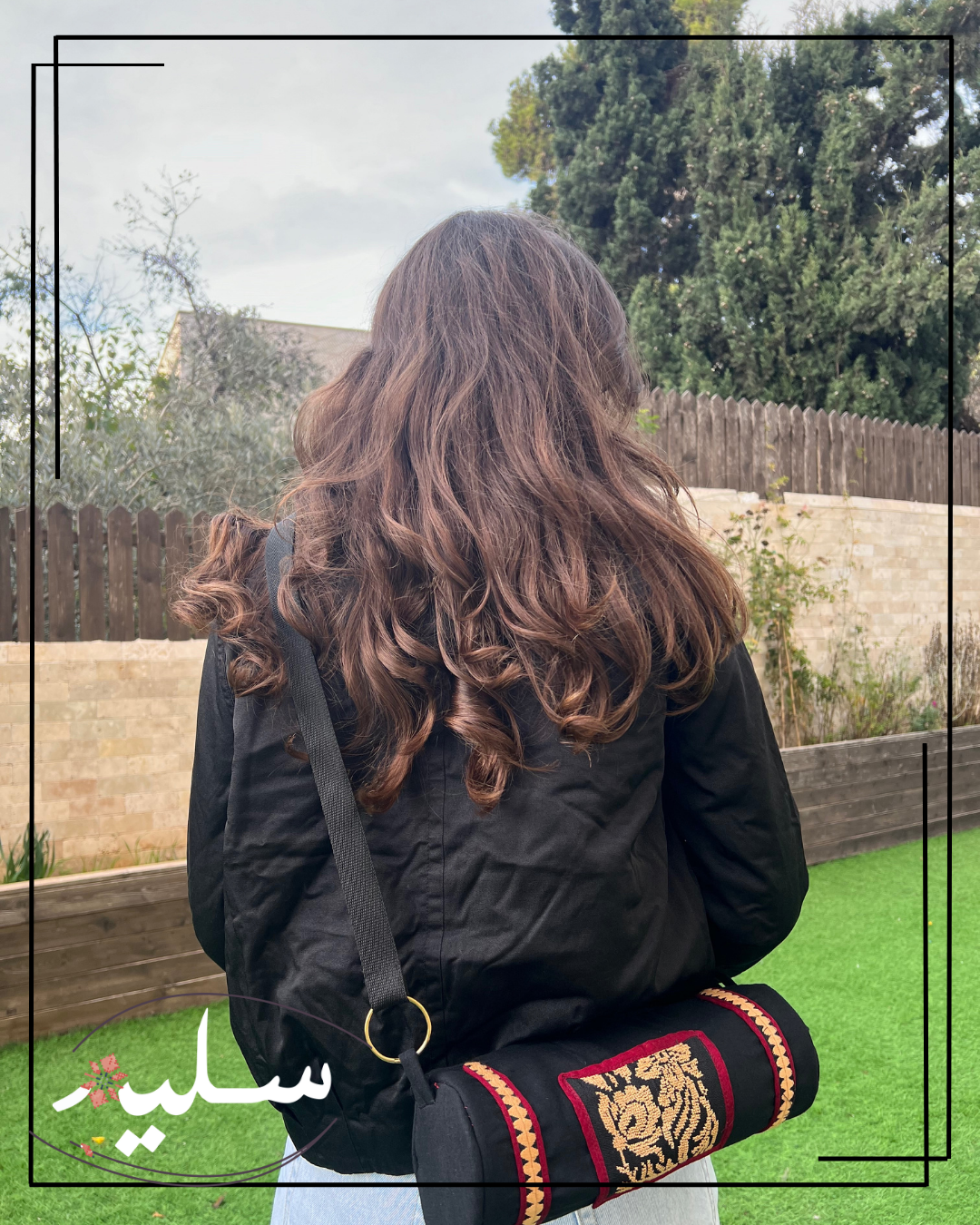 Unique cylindrical bag designed by Saleem. A one-of-a-kind bag, that is lined, durable and can hold a large capacity, with an internal pocket and a small pocket on the outside. With a floral handmade embroidery pattern and a logo, a signature piece to add to your bag collection.
