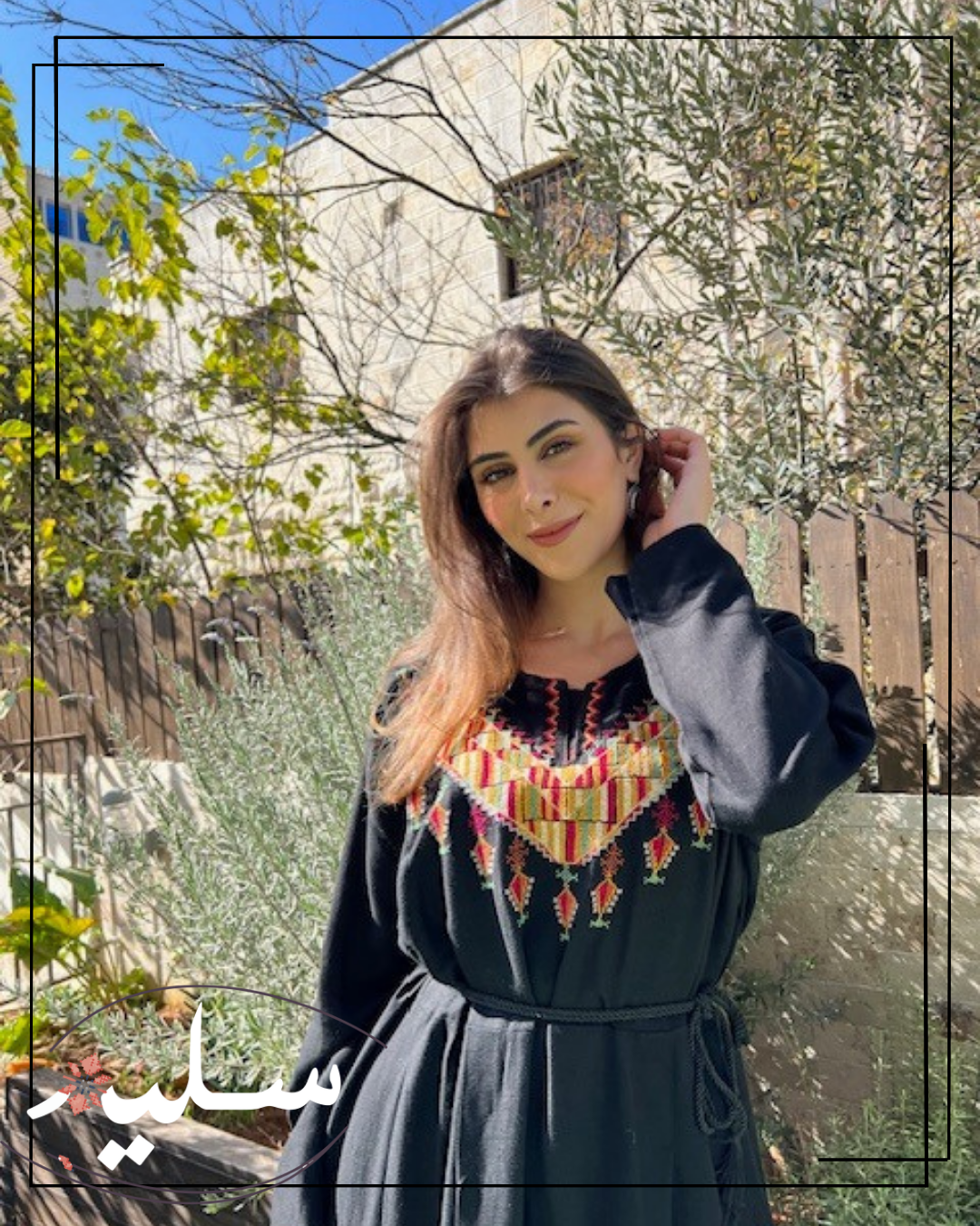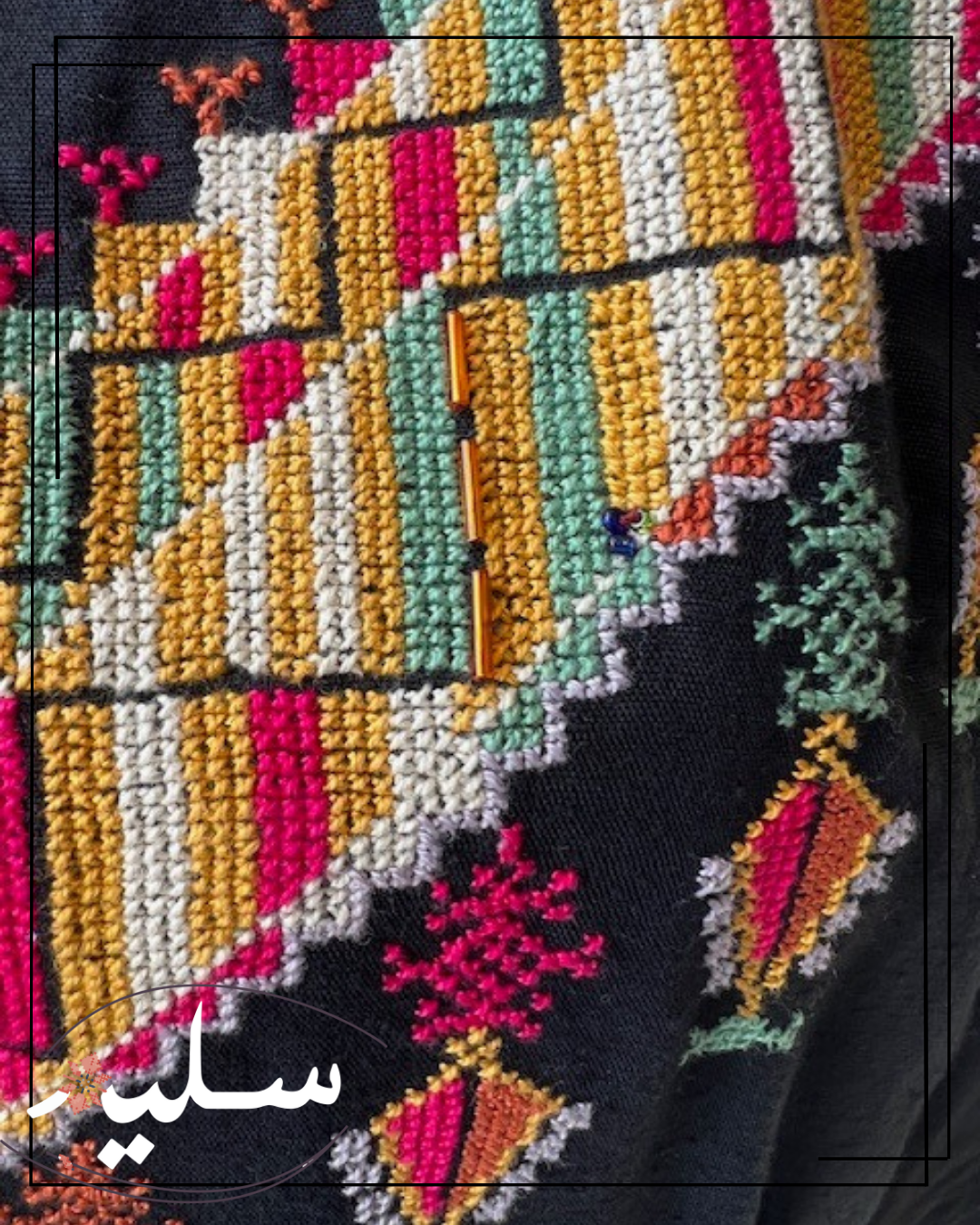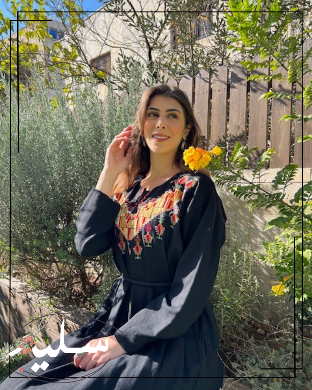 ثوب أسود أنيق من سليم، مصنوع من قماش اللينين، ومزين بتطريز يدوي بألوان دافئة وحيوية، مع إضافة خرز مميزة على الصدر. التطريز مستوحى من نقش القمح التقليدي الفلسطيني. يمكن تنسيق الثوب مع حزام لإطلالة أنثوية، أو بدونه لإطلالة يومية مريحة.
