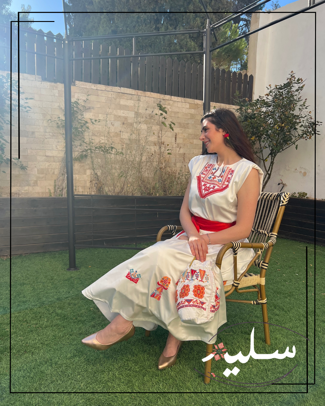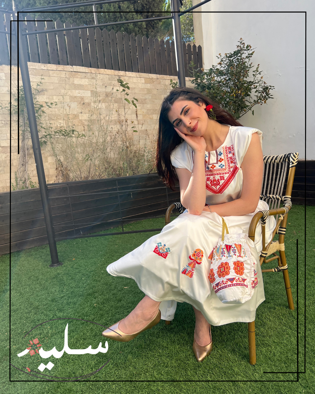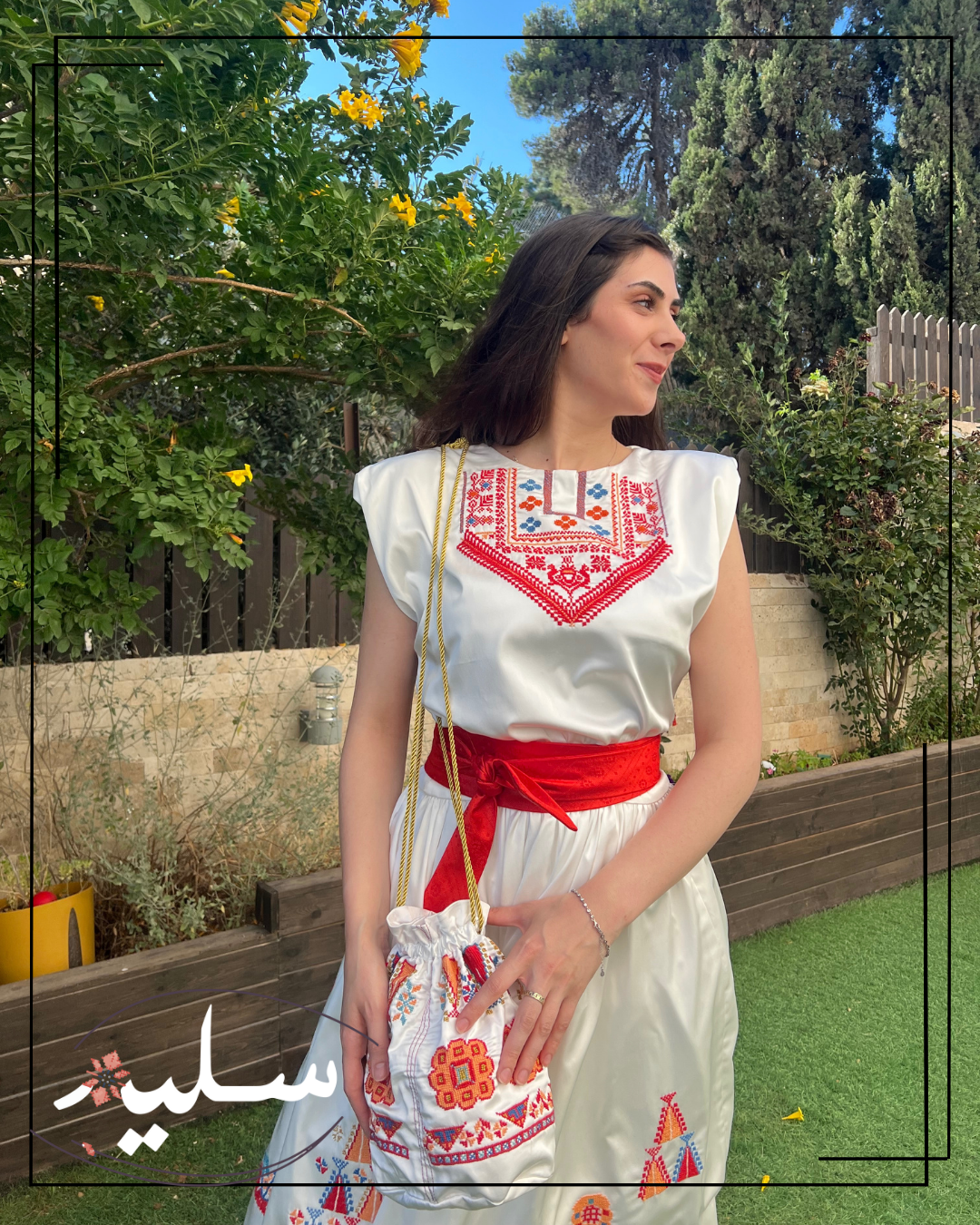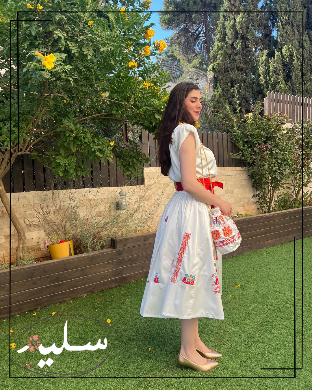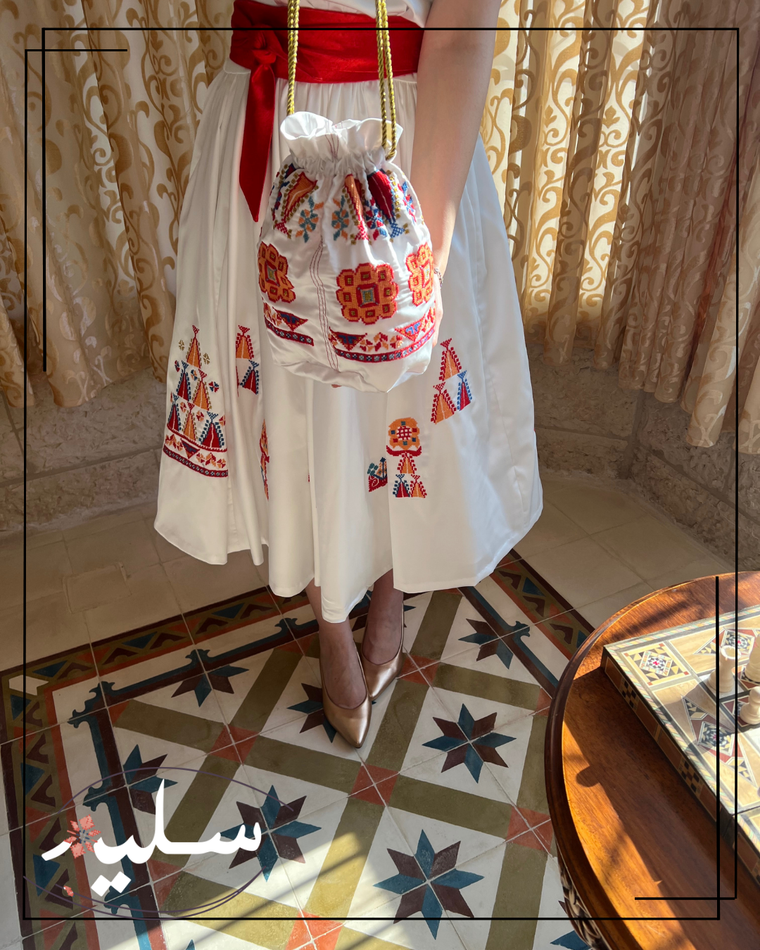 A luxurious dazzling dress designed for an unforgettable presence on your special occasion. Made from a stunning silky fabric that shines with femininity and elegance, featuring a comfortable and stylish cut with raised shoulders that boost confidence and create a distinctive look. The piece is adorned with artistic embroidery in the form of colorful veins with bright hues and shimmering golden threads, adding a touch of joy and luxury perfectly suited to the celebratory atmosphere. The dress comes with a soft lining and a separate inner skirt that provides an elegant flowing volume yet is light and comfortable for movement. To complete the charm, the dress is accompanied by a special hand-embroidered bag, designed harmoniously with the dress details and embroidery colors, ensuring you are elegant down to the finest details.