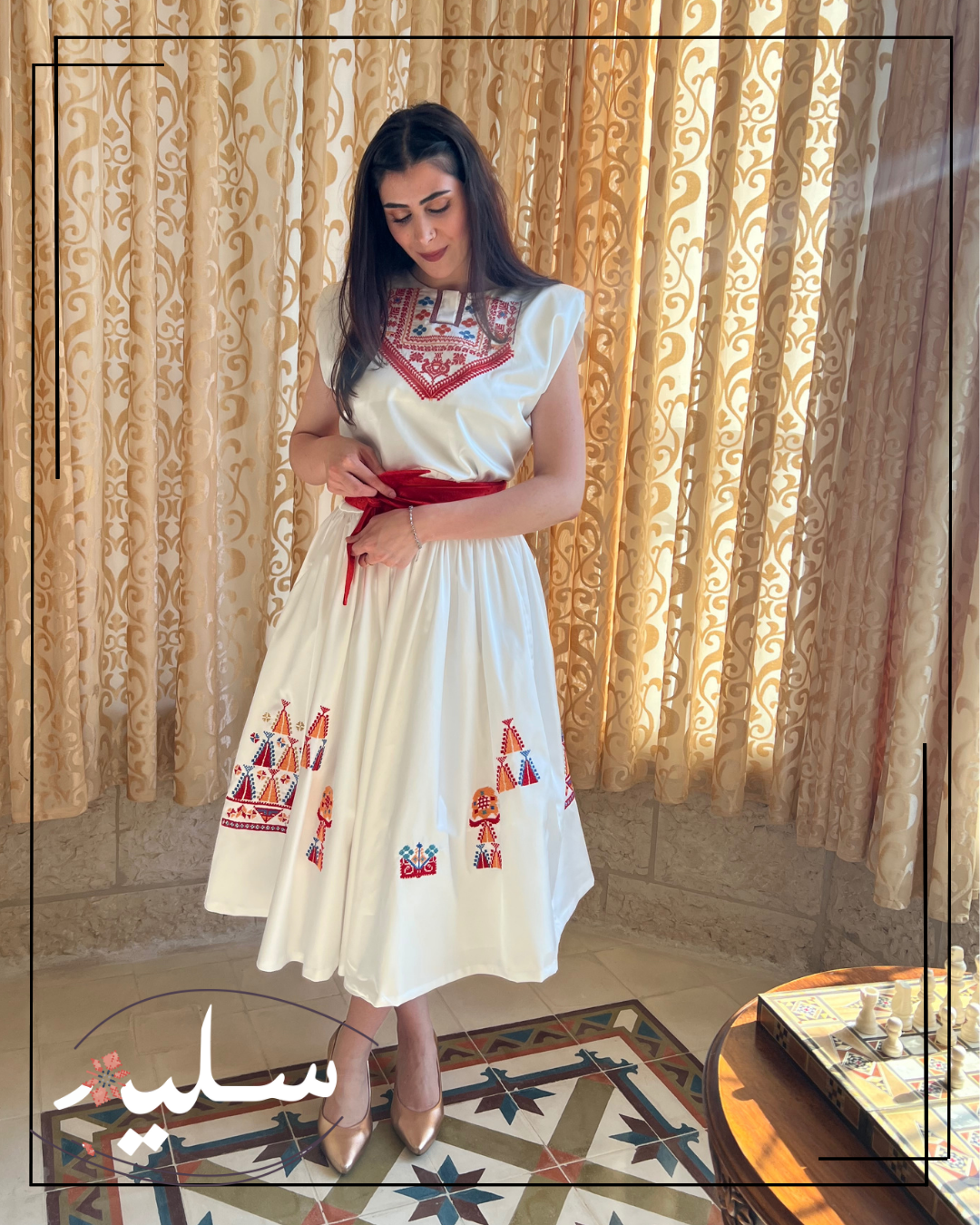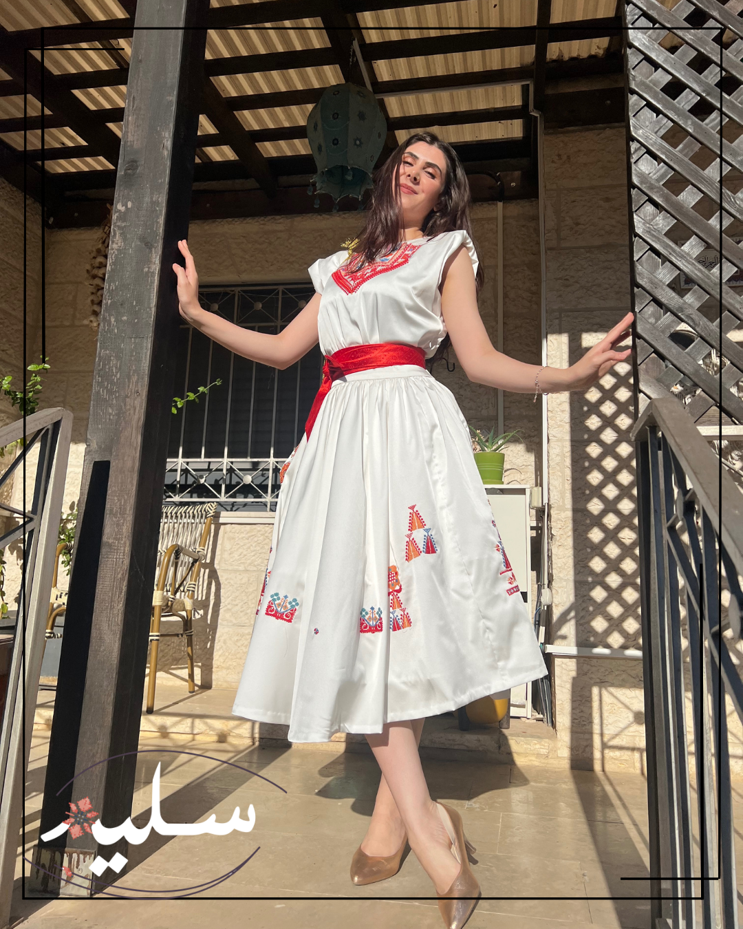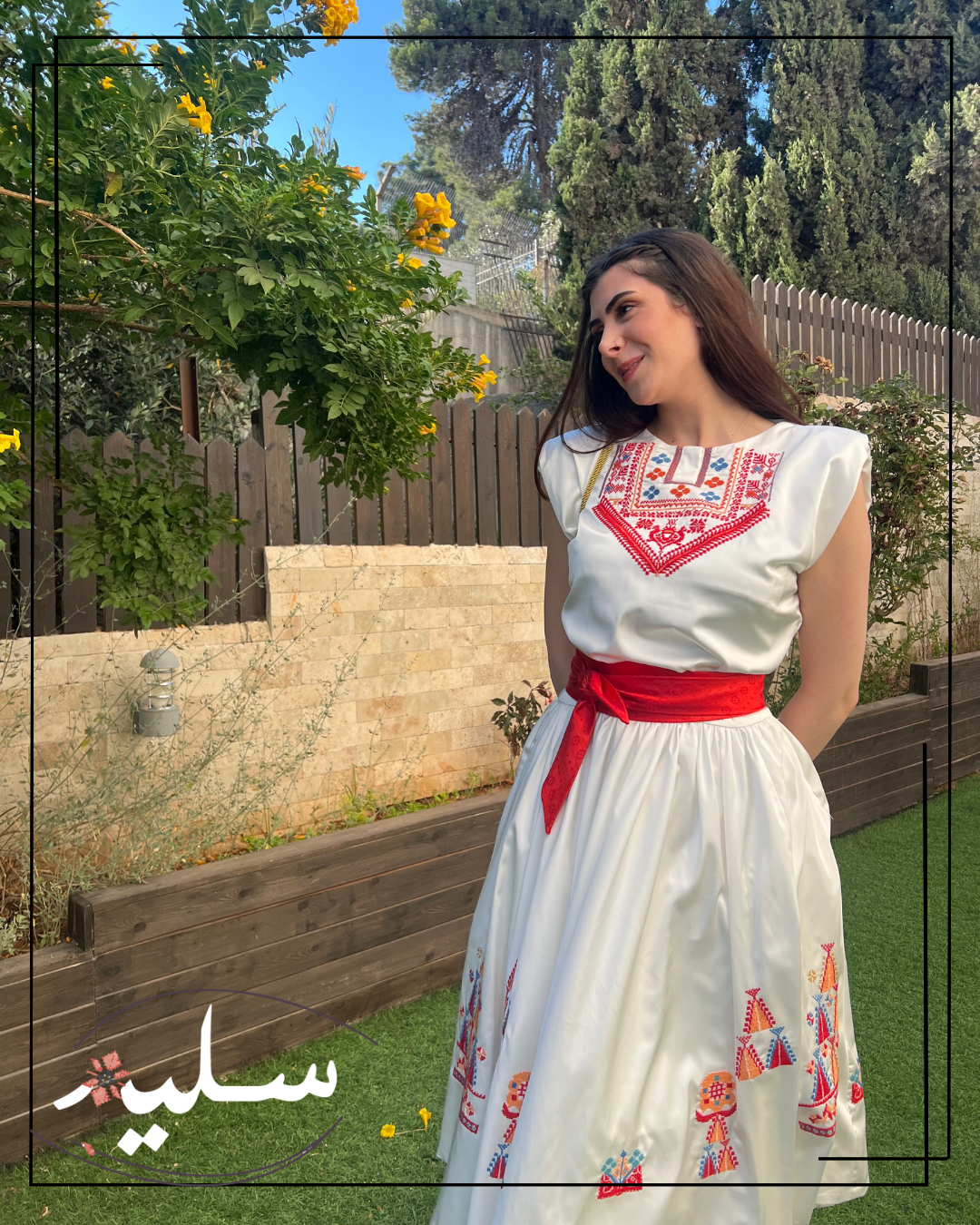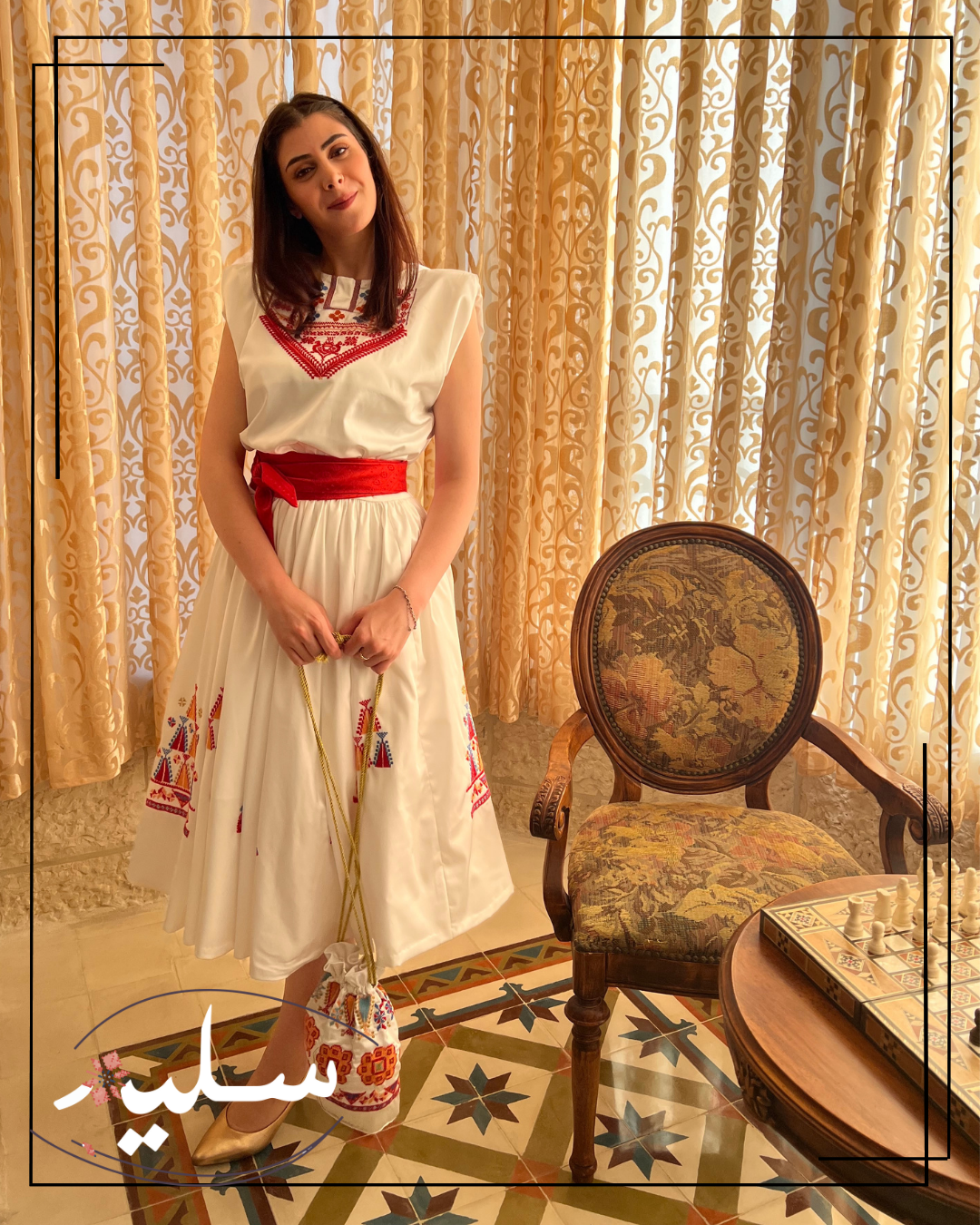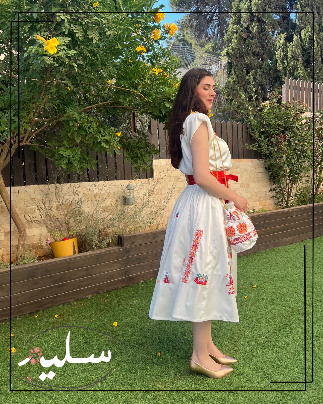 A luxurious dazzling dress designed for an unforgettable presence on your special occasion. Made from a stunning silky fabric that shines with femininity and elegance, featuring a comfortable and stylish cut with raised shoulders that boost confidence and create a distinctive look. The piece is adorned with artistic embroidery in the form of colorful veins with bright hues and shimmering golden threads, adding a touch of joy and luxury perfectly suited to the celebratory atmosphere. The dress comes with a soft lining and a separate inner skirt that provides an elegant flowing volume yet is light and comfortable for movement. To complete the charm, the dress is accompanied by a special hand-embroidered bag, designed harmoniously with the dress details and embroidery colors, ensuring you are elegant down to the finest details.