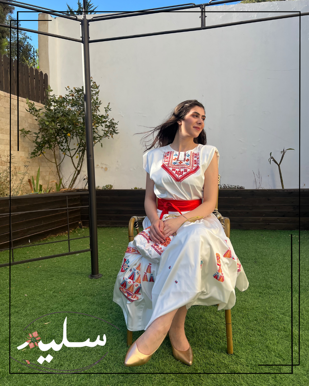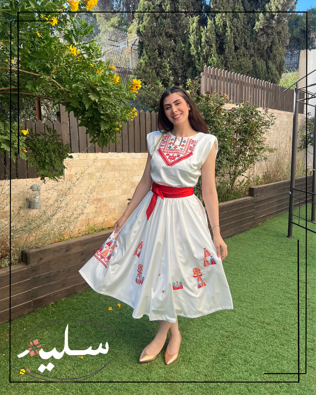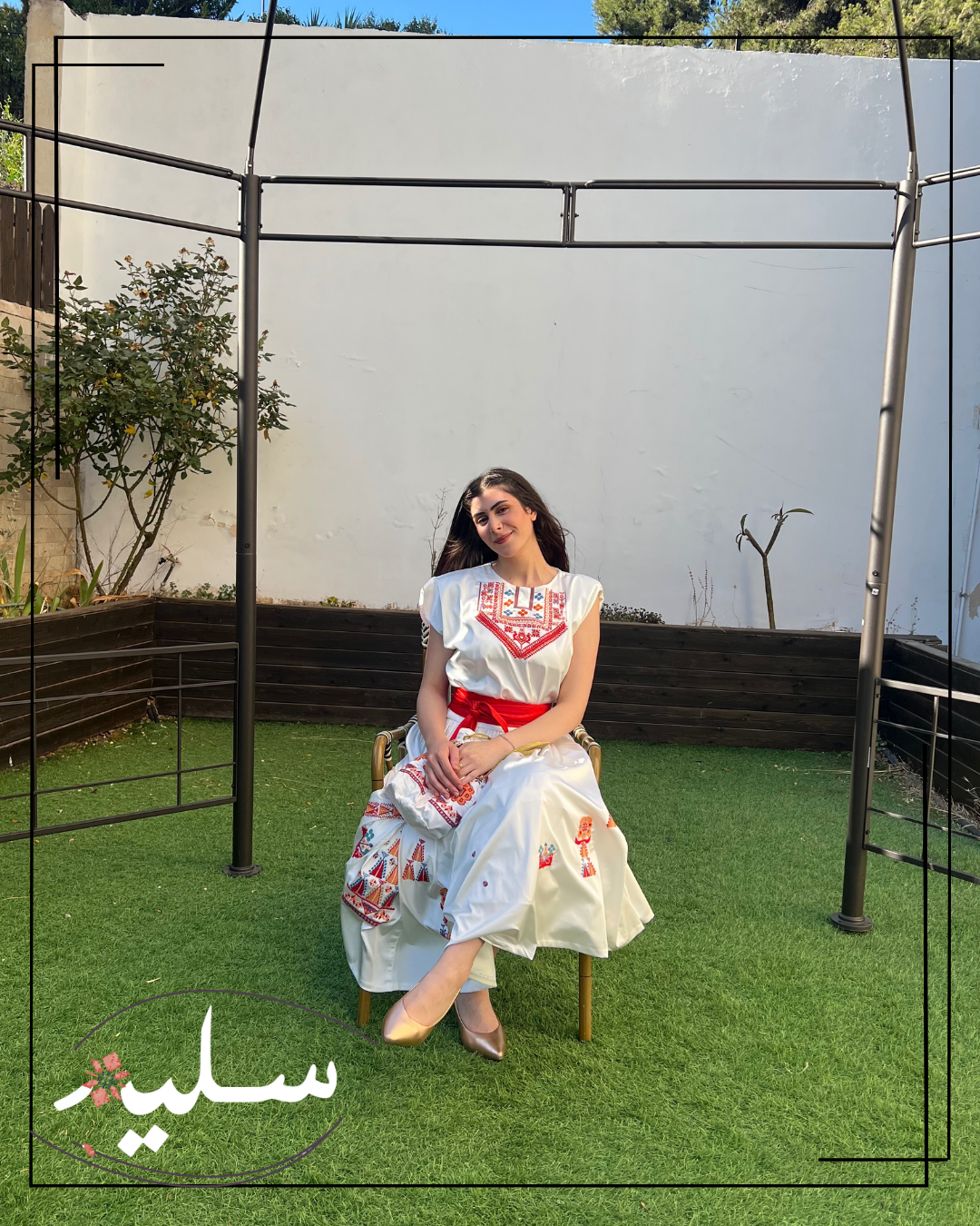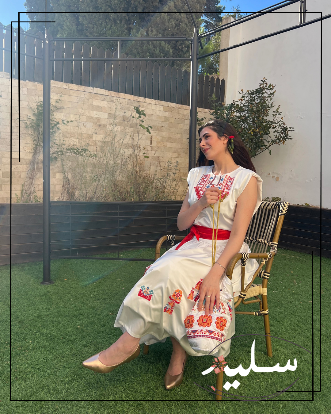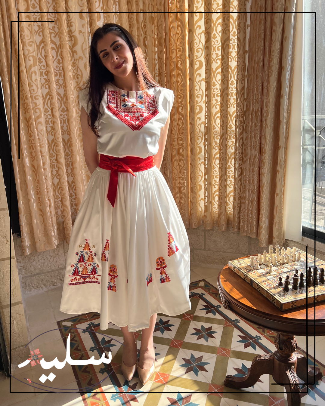 A luxurious dazzling dress designed for an unforgettable presence on your special occasion. Made from a stunning silky fabric that shines with femininity and elegance, featuring a comfortable and stylish cut with raised shoulders that boost confidence and create a distinctive look. The piece is adorned with artistic embroidery in the form of colorful veins with bright hues and shimmering golden threads, adding a touch of joy and luxury perfectly suited to the celebratory atmosphere. The dress comes with a soft lining and a separate inner skirt that provides an elegant flowing volume yet is light and comfortable for movement. To complete the charm, the dress is accompanied by a special hand-embroidered bag, designed harmoniously with the dress details and embroidery colors, ensuring you are elegant down to the finest details.