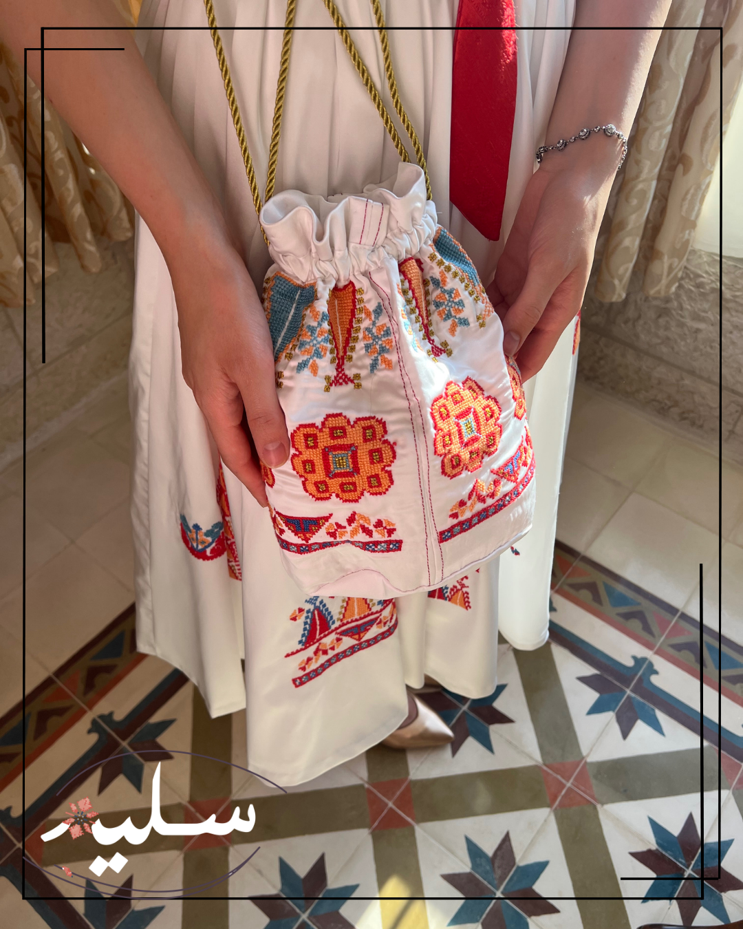 - Drawstring bag featuring embroidery that harmonizes with the dress.