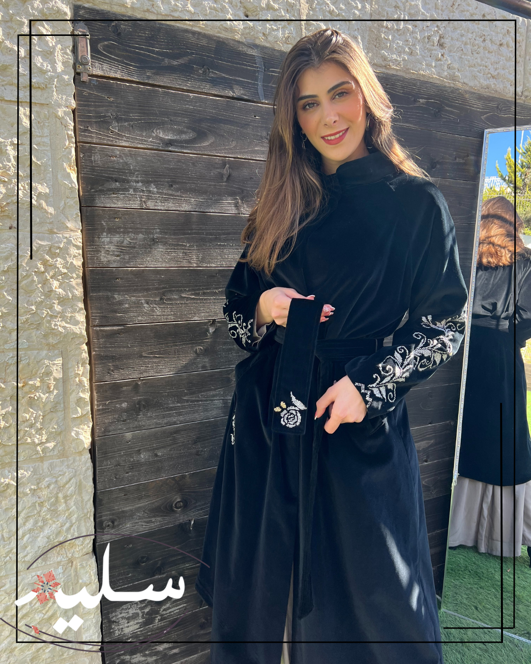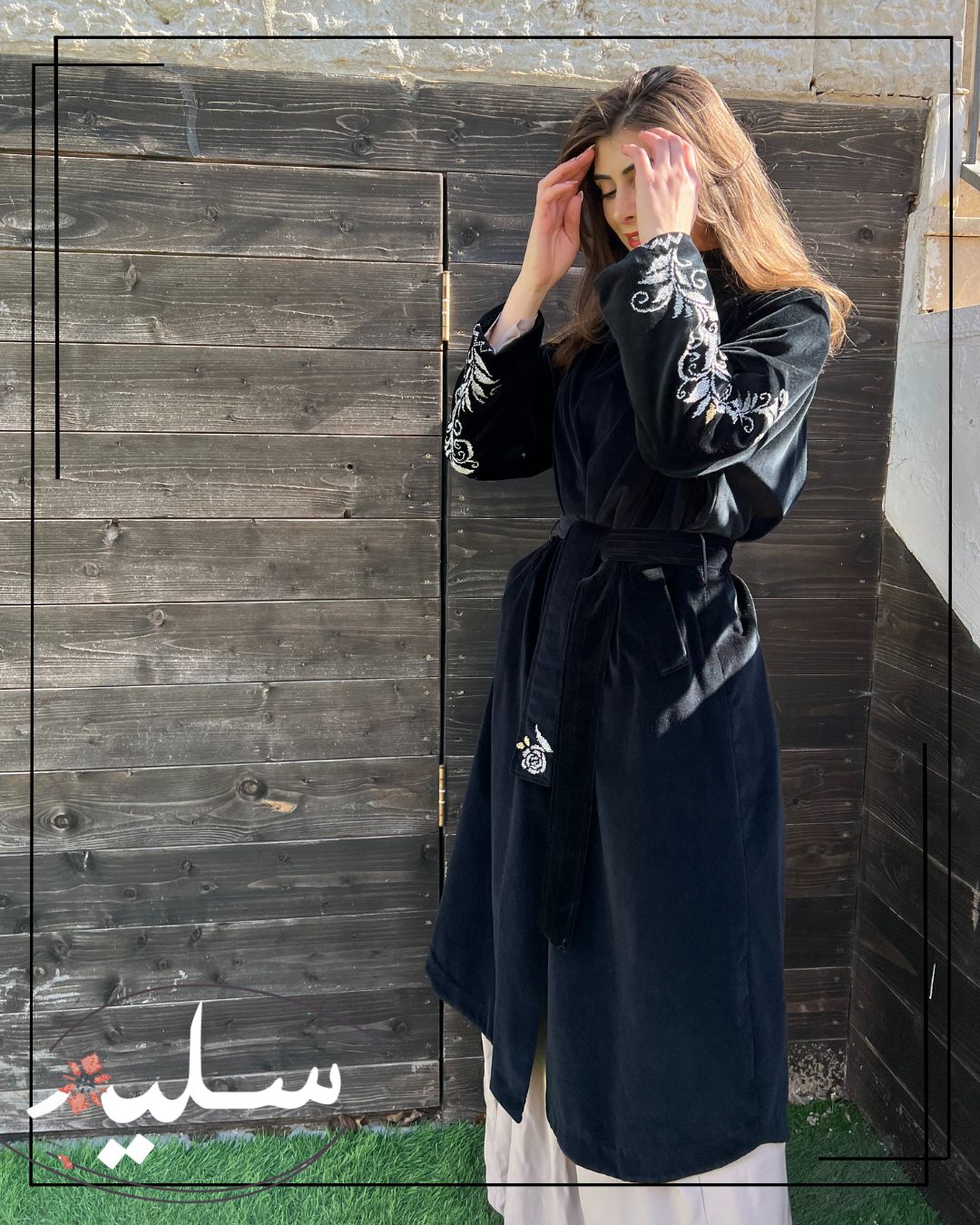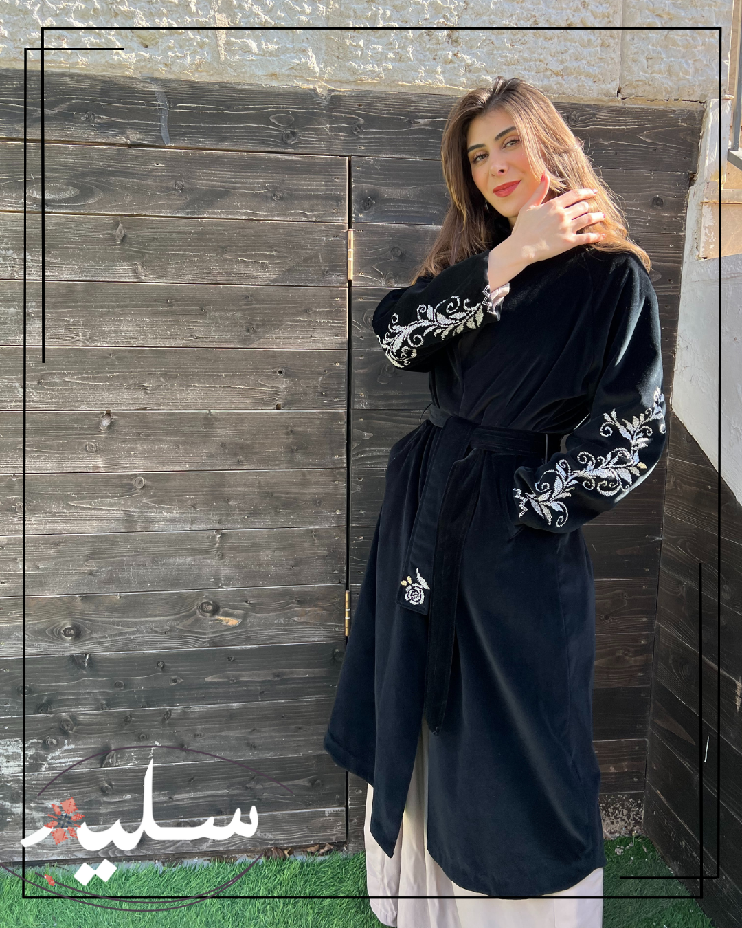 من نفس قماش المخمل طويل بحزام من سليم، مزين بتطريز يدوي باللون الفضي على الأكمام. قطعة الفريدة مع تطريز ناعم لزهرة لإضفاء لمسة أنثوية واثقة. كما يحتوي على جيوب واسعة بتفاصيل مطرزة كذلك. قطعة أنيقة لفصل الشتاء والخريف و أضيفة رائعة لخزانتكِ.