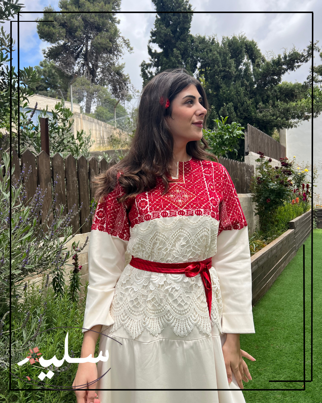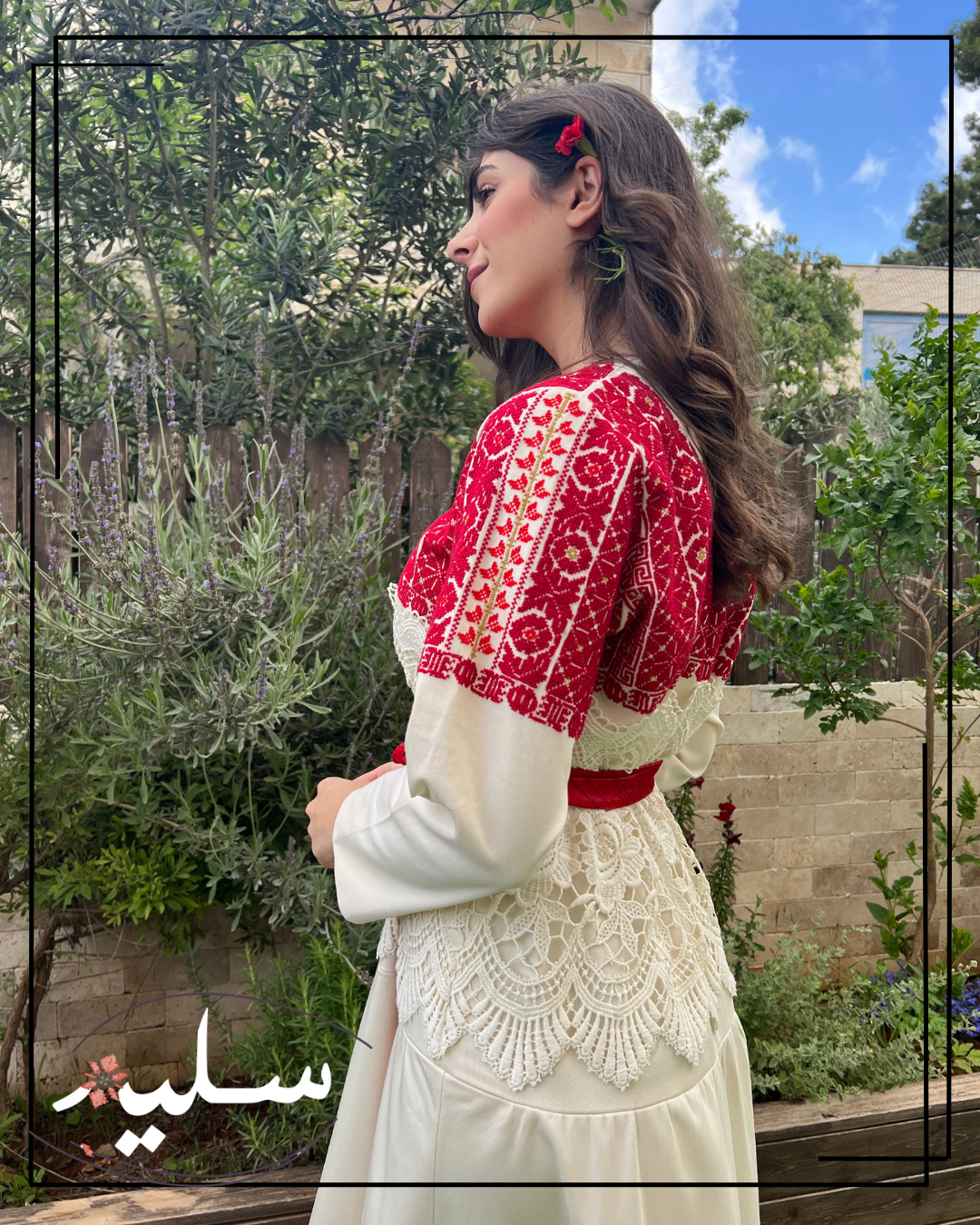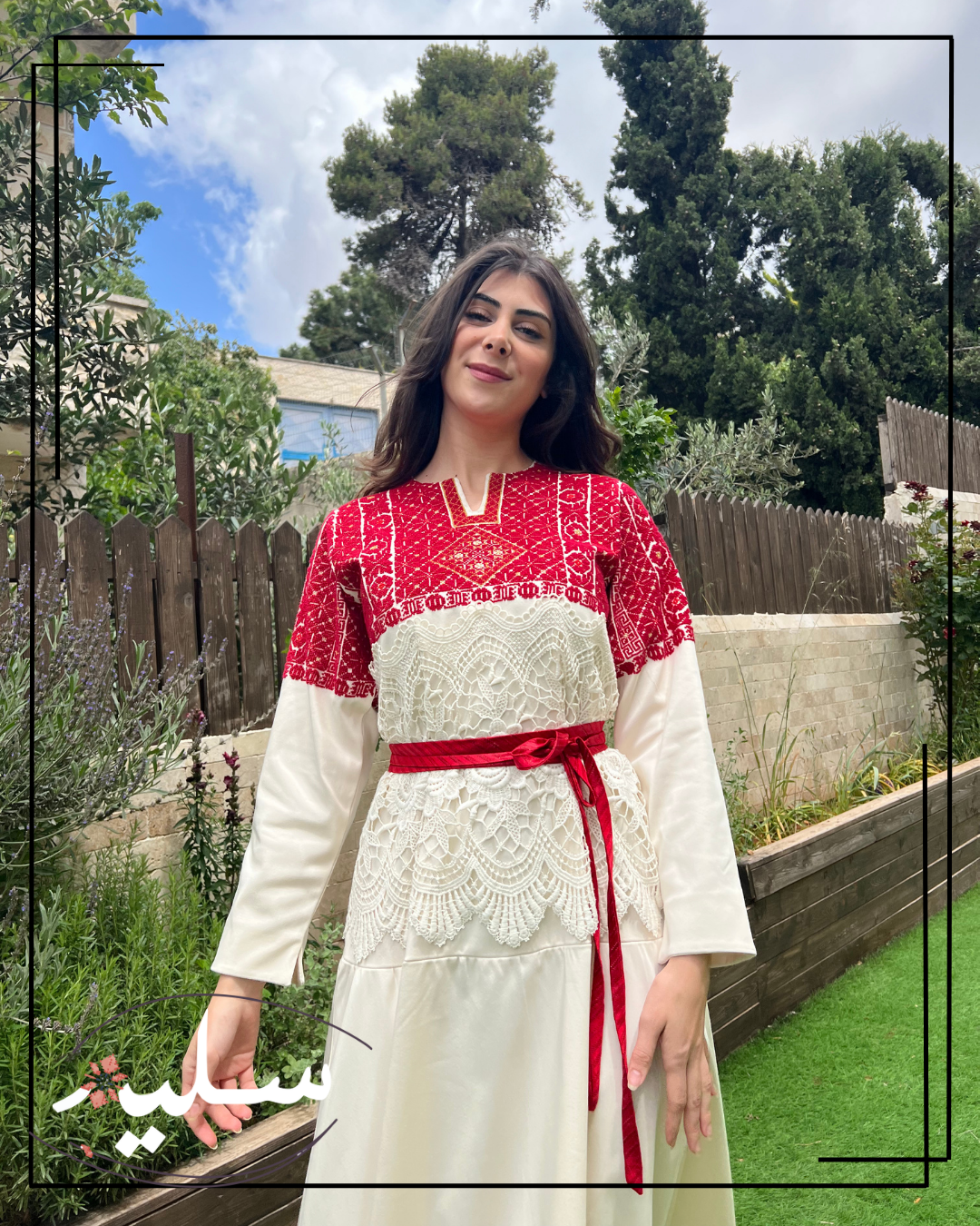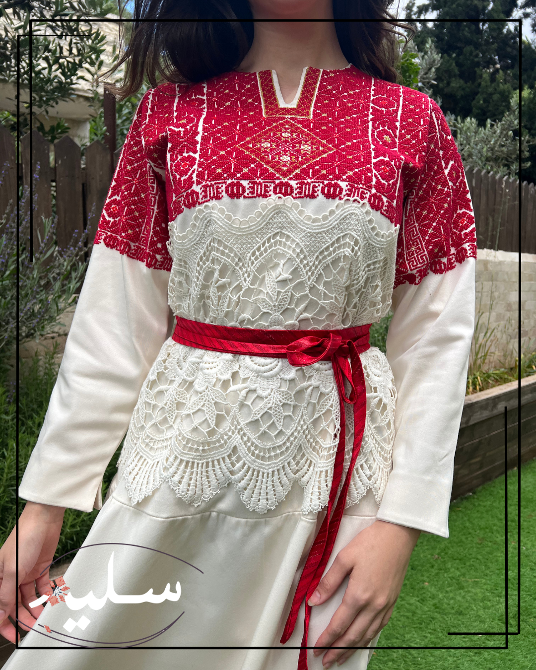 فستان رسمي مبتكر من سليم للمناسبات الفاخرة. مطرز بدرجات اللون الأحمر وممزوج بخيوط ذهبية. تزين هذه القطعة أنماط تطريز تقليدية، نادرًا ما يتم تكرارها. يرافق الفستان حزام أحمر من قماش دمشقي بخيوط معدنية. الفستان مصنوع من قطن مدمج عالي الجودة ومزين بقماش جوبير حول الخصر مما يضيف لمسة فريدة تشبه استخدام الوسائط المختلطة في الفن! قطعة استثنائية حقًا من سليم.