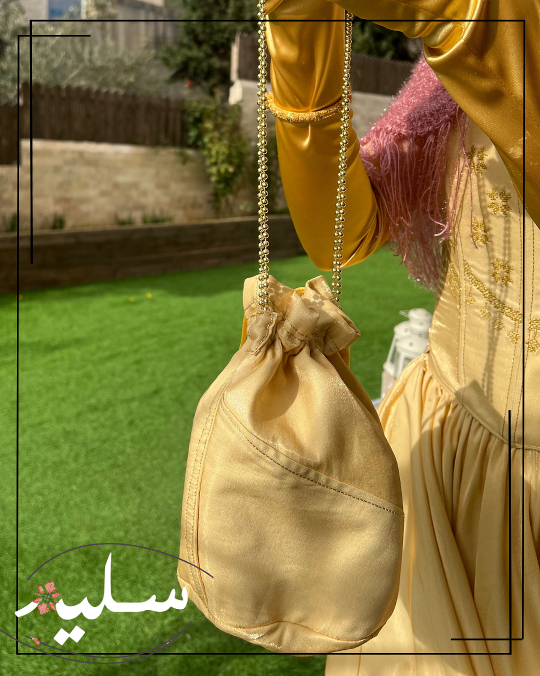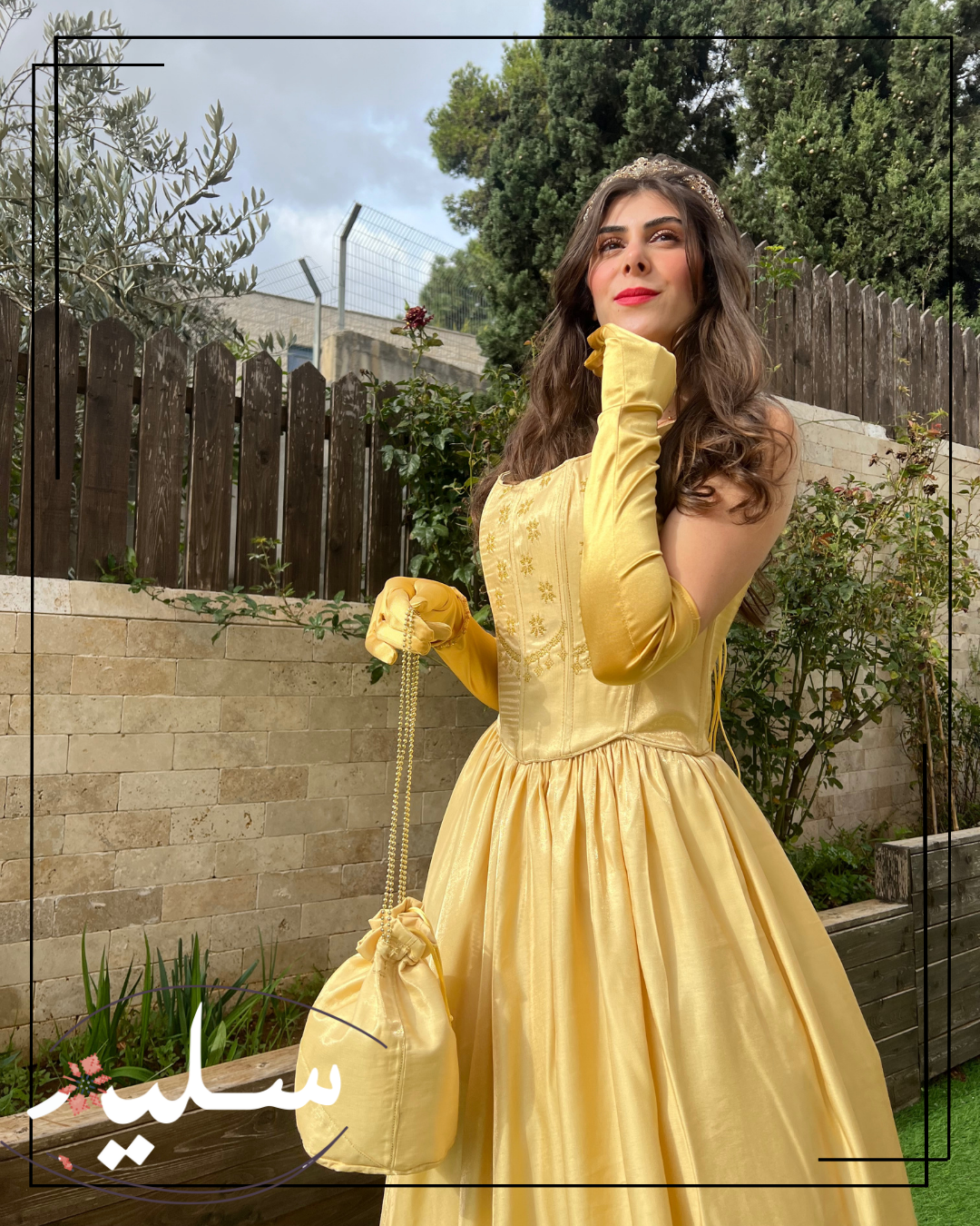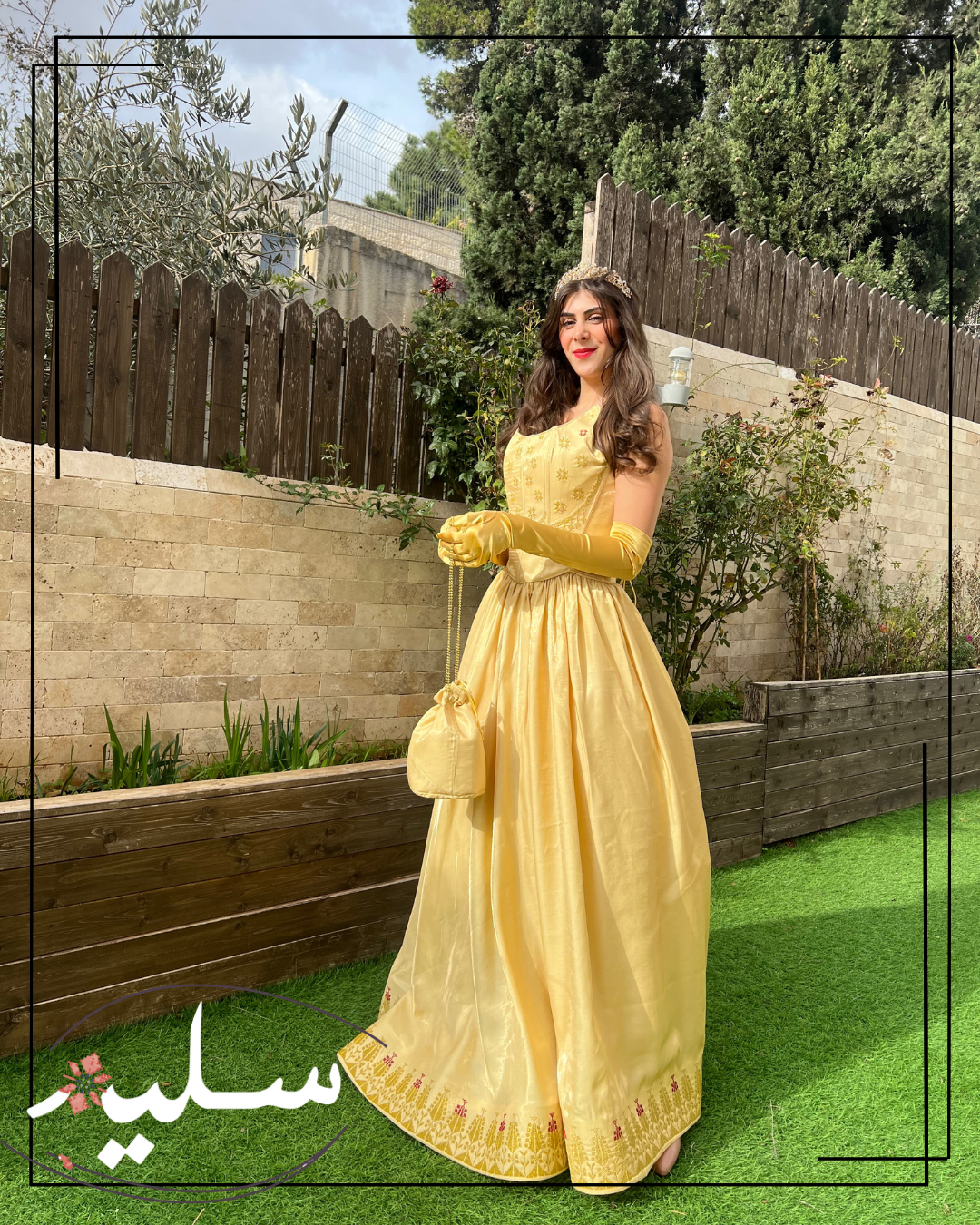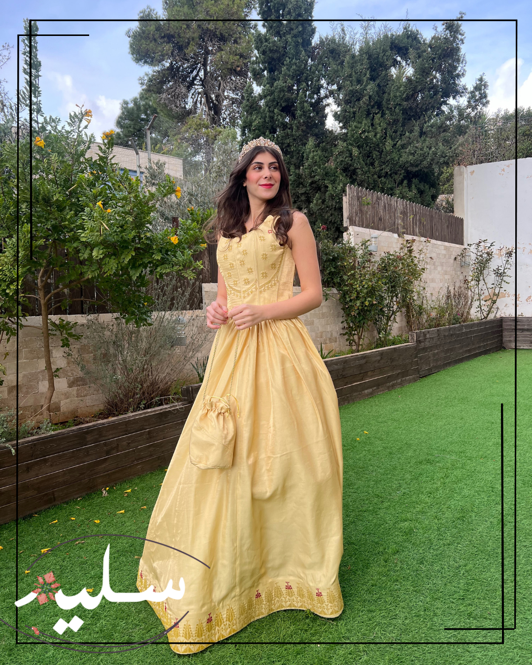 طقم الأميرة الفلسطينية مصمم لحفلة الحناء، حفلات الحناء هي تقليد فلسطيني أصيل ، يتكون هذا الطقم من قطعتين، كورسيه مدعم مع خيوط للربط في الخلف لتعديل المقاس حسب الرغبة مما يمنحه مظهرًا أنثويًا و خاصا لصاحبته ، التنورة مصنوعة من نفس القماش الذهبي، مع تنورة داخلية لإضفاء حجم للتنورة الأساسية ، كما يمكن إزالة التنورة حسب الرغبة، التطريز اليدوي بنمط النجوم التقليدية مطرزة بخيوط ذهبية.