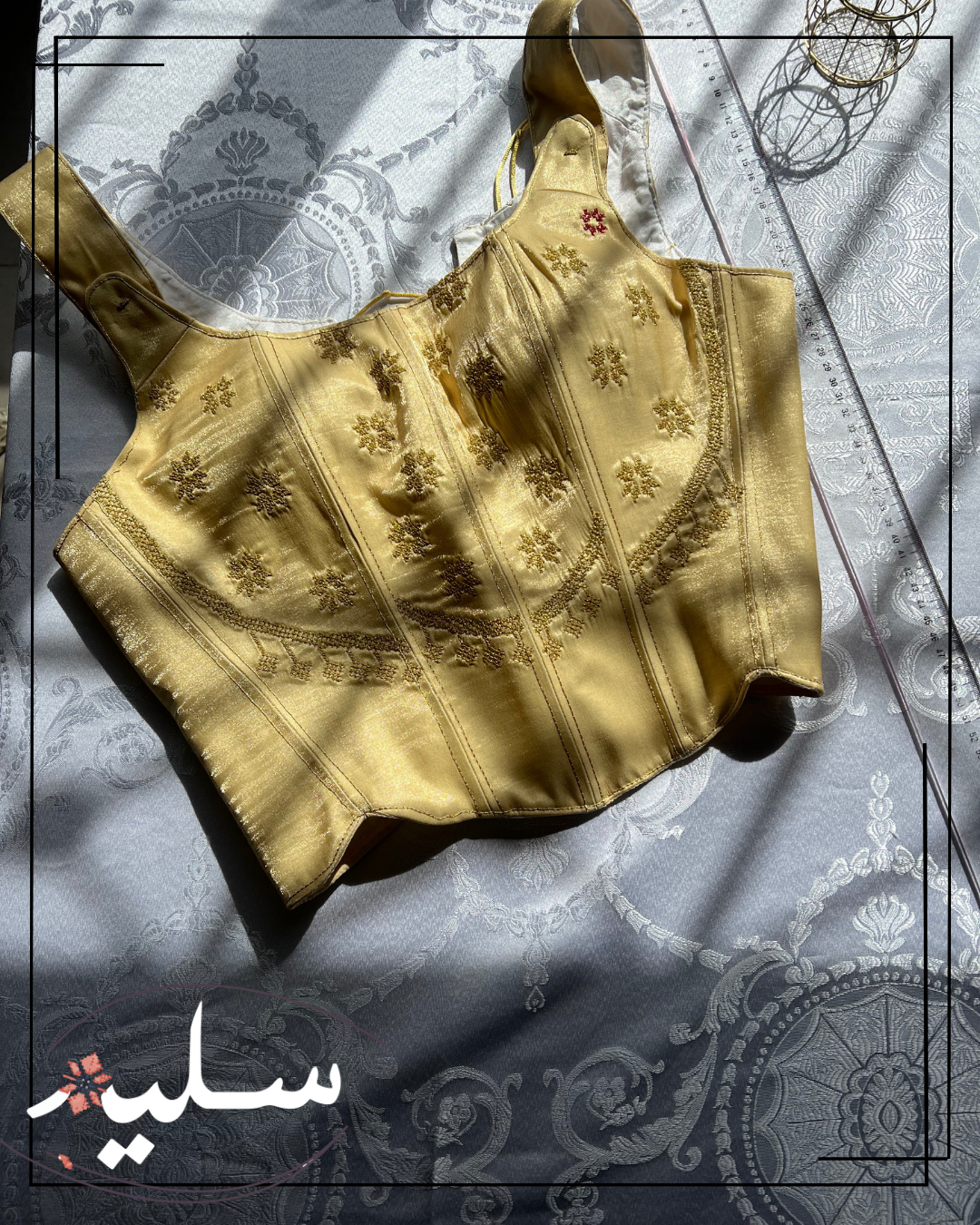 The Palestinian princess set is designed for a Henna party. Henna parties are a Palestinian tradition. This set is composed of 2 pieces. An adjustable corset with boning, giving it a structured and feminine look. The skirt is made of the same golden fabric, with an underskirt to give it volume. The skirt can also be removed according to personal preference. The hand-made embroidery features traditional stars made of golden threads.