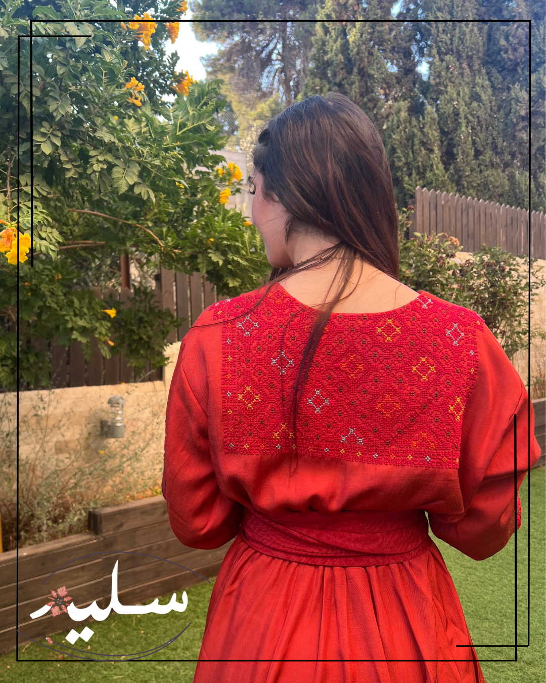 فستان مخصر فاخر بلون قرمزي آسر، مصنوع من قماش عالي الجودة ينبض بالأناقة. يتميز بتطريز تقليدي متقن وموزّع بدلال على كامل الفستان، باستخدام ألوان “rustic” دافئة تتناغم بسحر خاص مع خيوط زرقاء سماوية منثورة كالعروق، تضيف لمسة فنية أخاذة. الزنار الحريري العريض والطويل يلف مرتين حول الخصر، ليبرز جماله ويمنحك قوامًا أنيقًا ومتوازنًا. التصميم الفريد والخامة الفاخرة يمنحان من ترتديه شعورًا بالخفة والرشاقة والثقة مع كل خطوة. قطعة تلفت الأنظار وتمنحك حضورًا لا يُنسى
