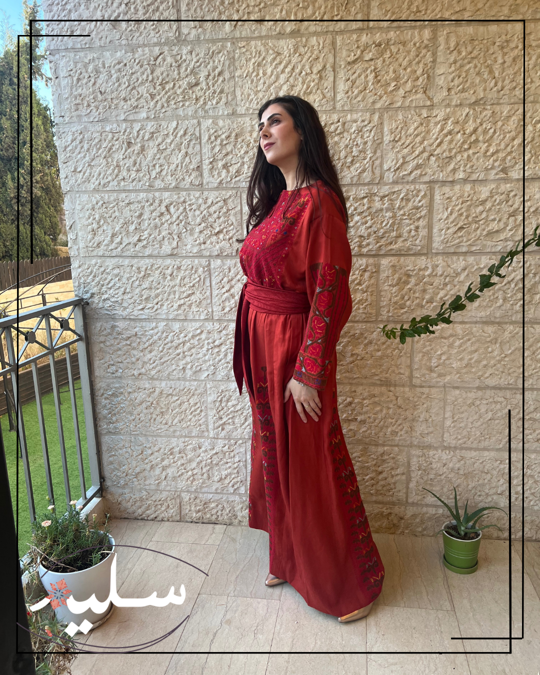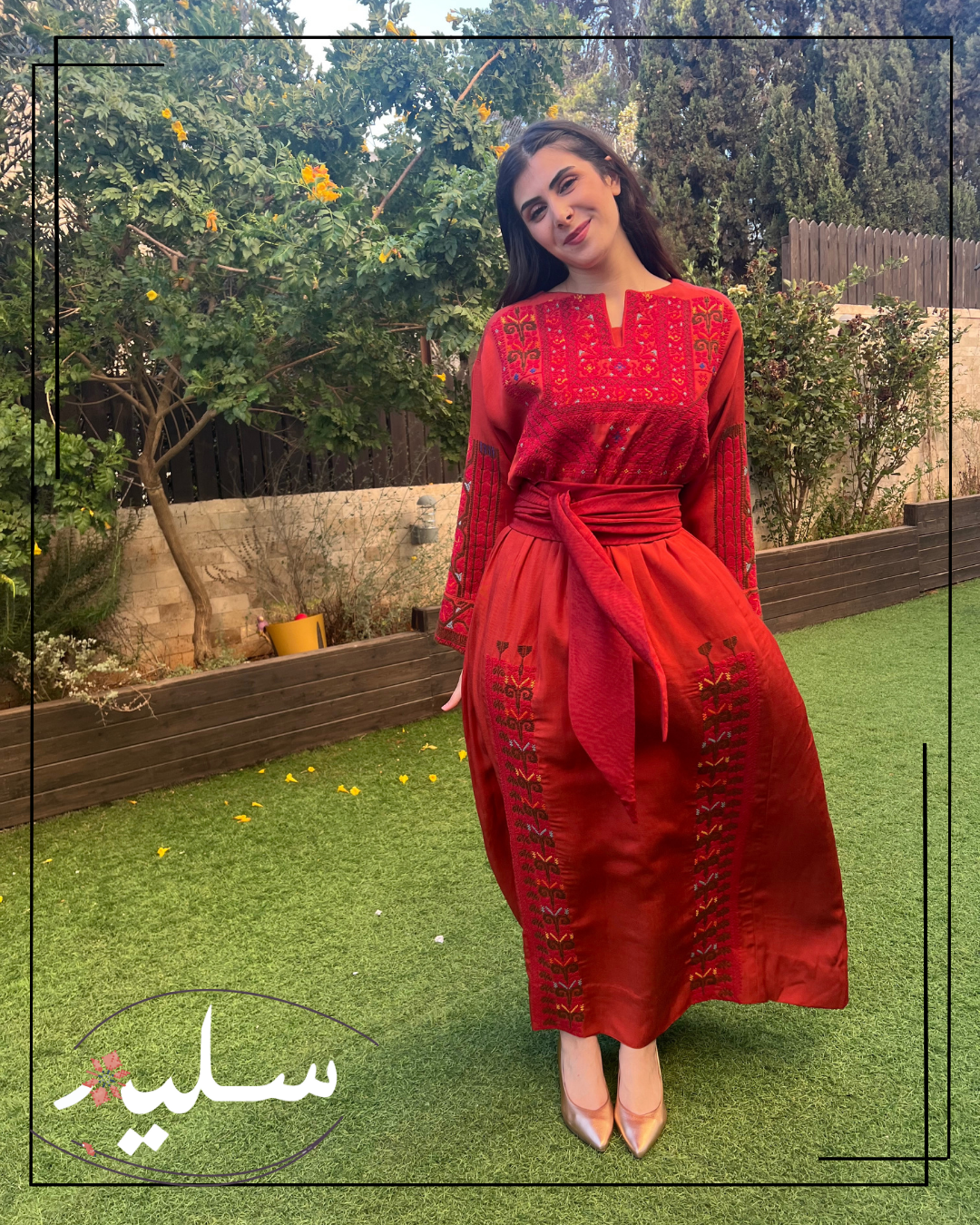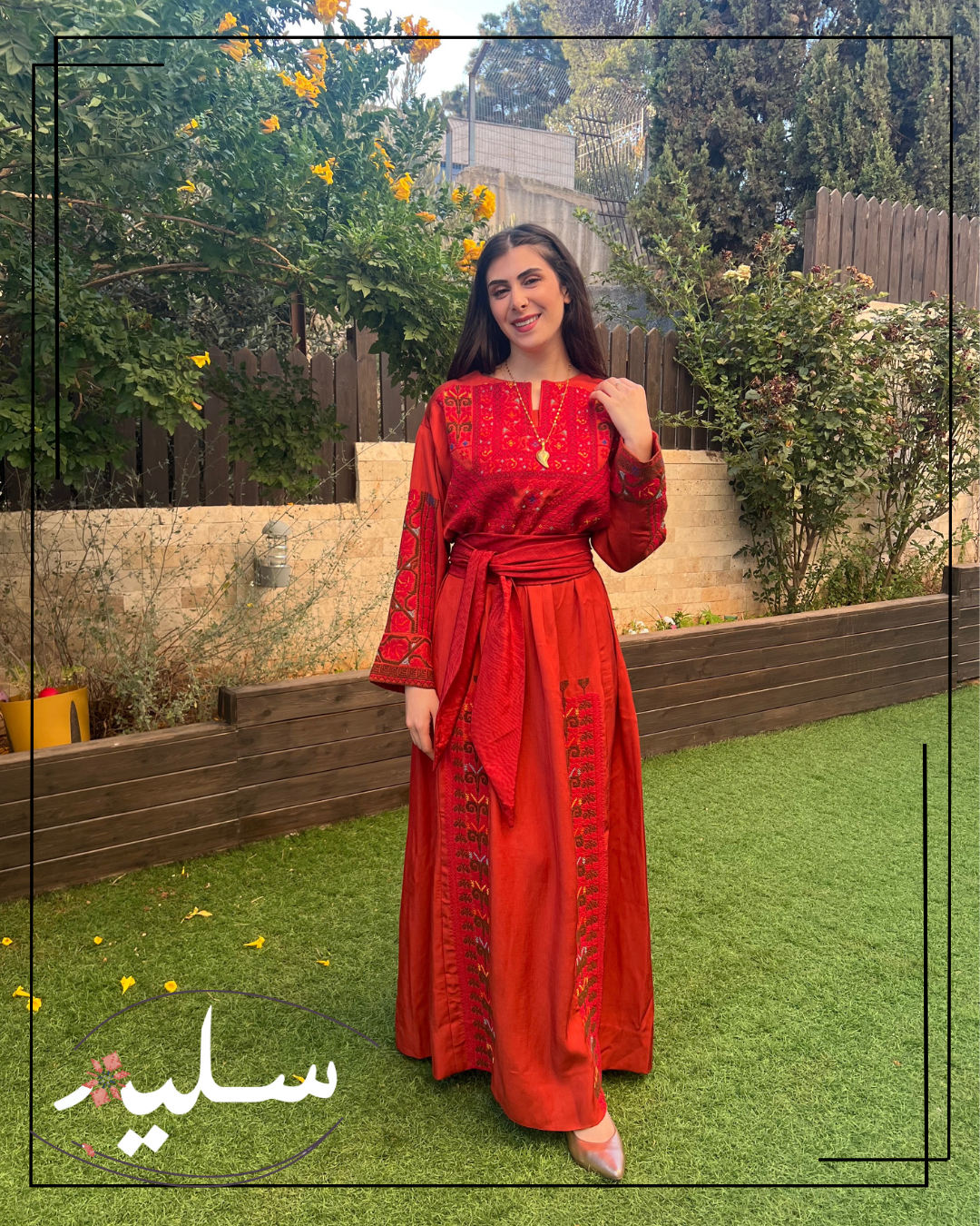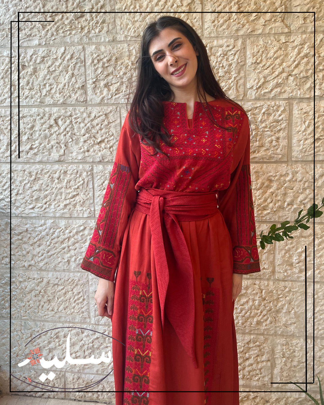 A luxurious fitted thoub in a charming crimson color, crafted from high-quality fabric that radiates elegance. It features finely detailed traditional embroidery skillfully spread across the entire dress, using warm rustic tones that harmonize beautifully with sky-blue threads scattered like vines, adding a stunning artistic touch. The wide, long silk belt wraps twice around the waist, accentuating its beauty and giving you a sleek, balanced silhouette. The unique design and premium materials give a sense of lightness, grace, and confidence with every step. A standout piece that draws attention and ensures an unforgettable presence. A truly exceptional piece from Saleem.
