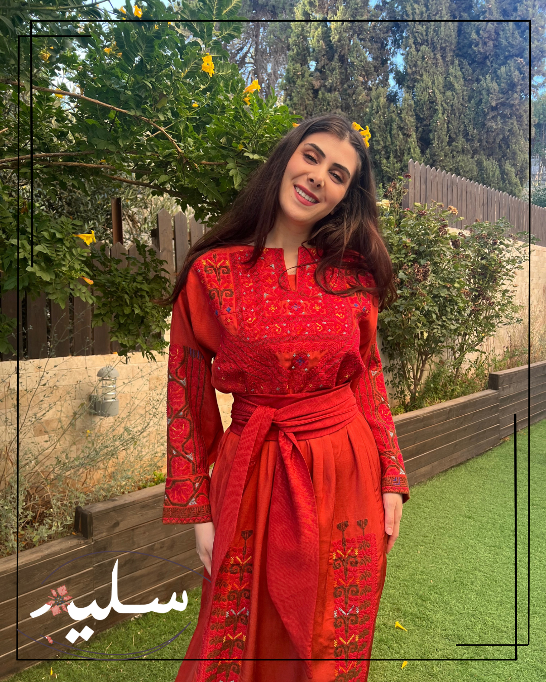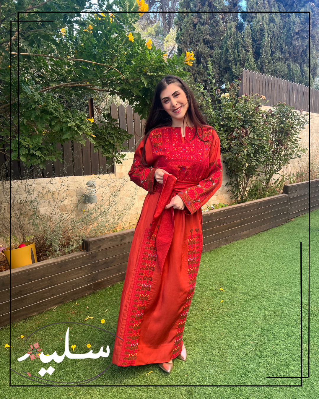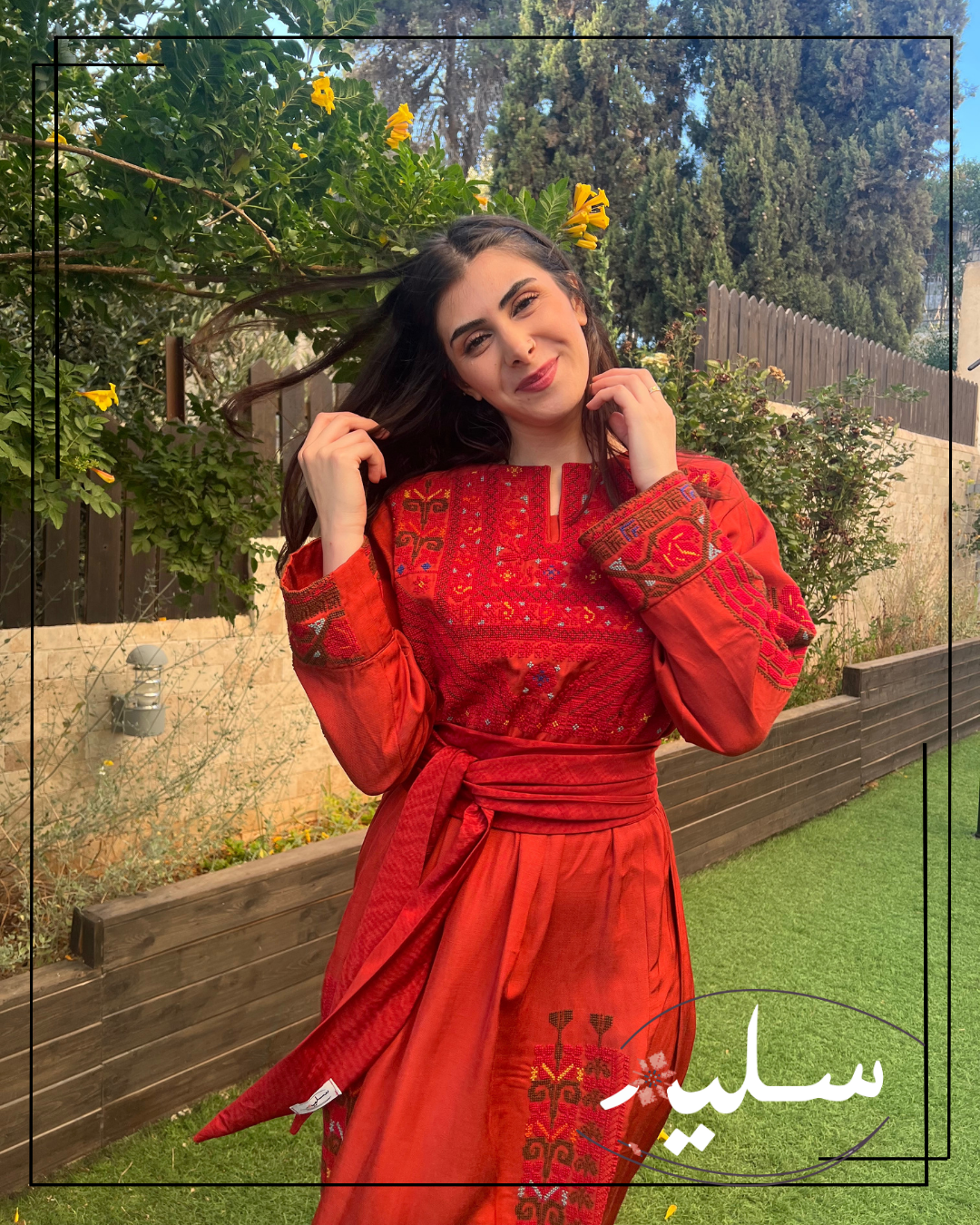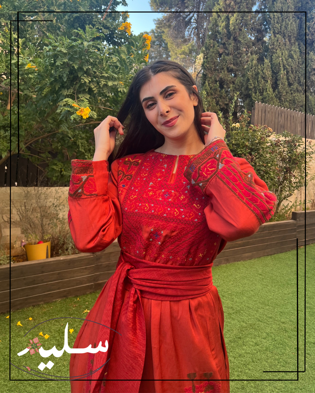 A luxurious fitted thoub in a charming crimson color, crafted from high-quality fabric that radiates elegance. It features finely detailed traditional embroidery skillfully spread across the entire dress, using warm rustic tones that harmonize beautifully with sky-blue threads scattered like vines, adding a stunning artistic touch. The wide, long silk belt wraps twice around the waist, accentuating its beauty and giving you a sleek, balanced silhouette. The unique design and premium materials give a sense of lightness, grace, and confidence with every step. A standout piece that draws attention and ensures an unforgettable presence. A truly exceptional piece from Saleem.