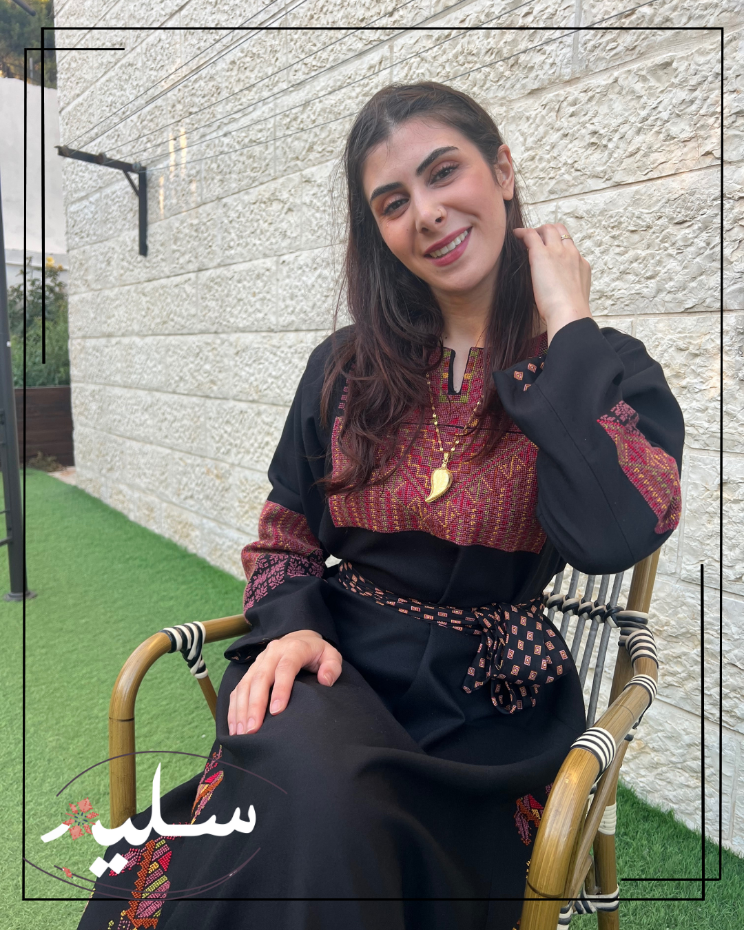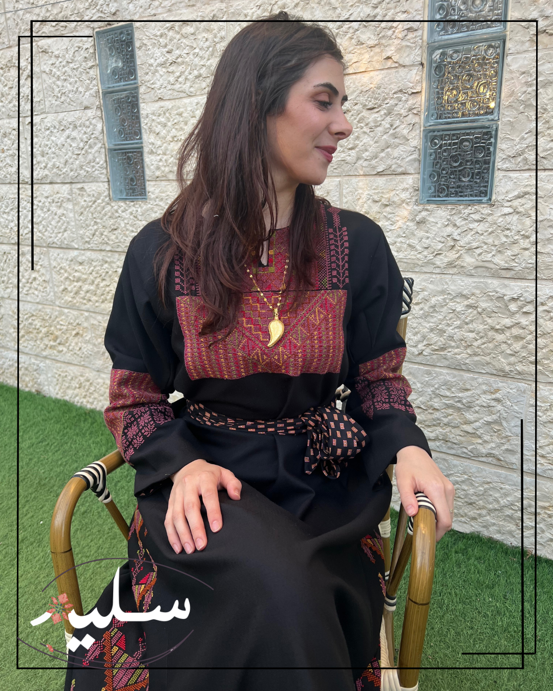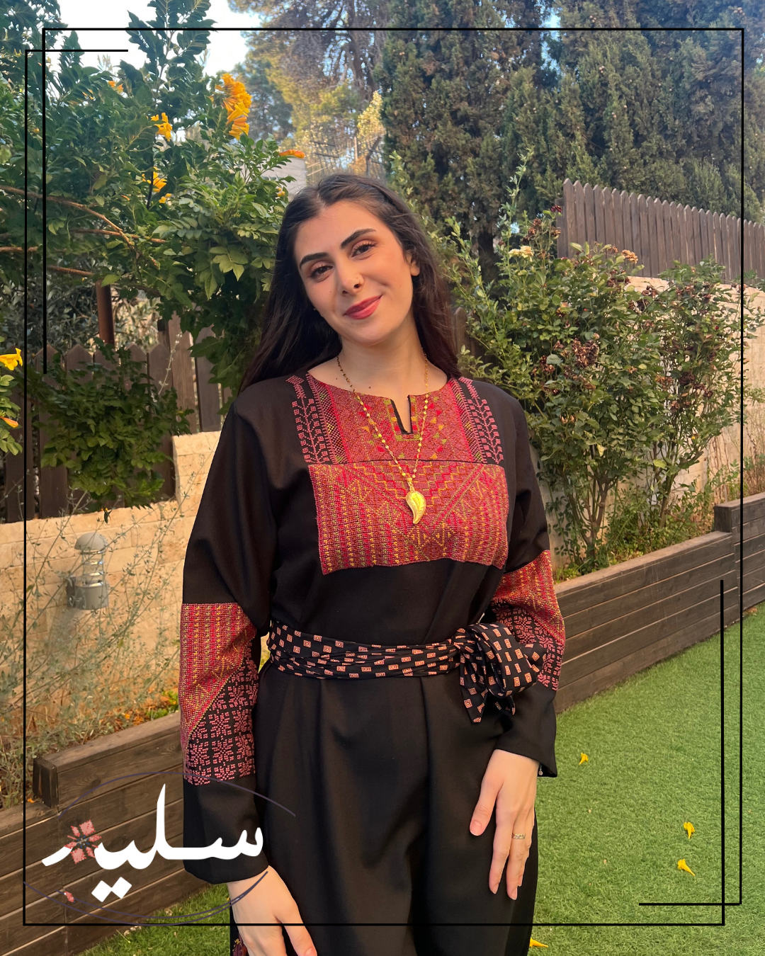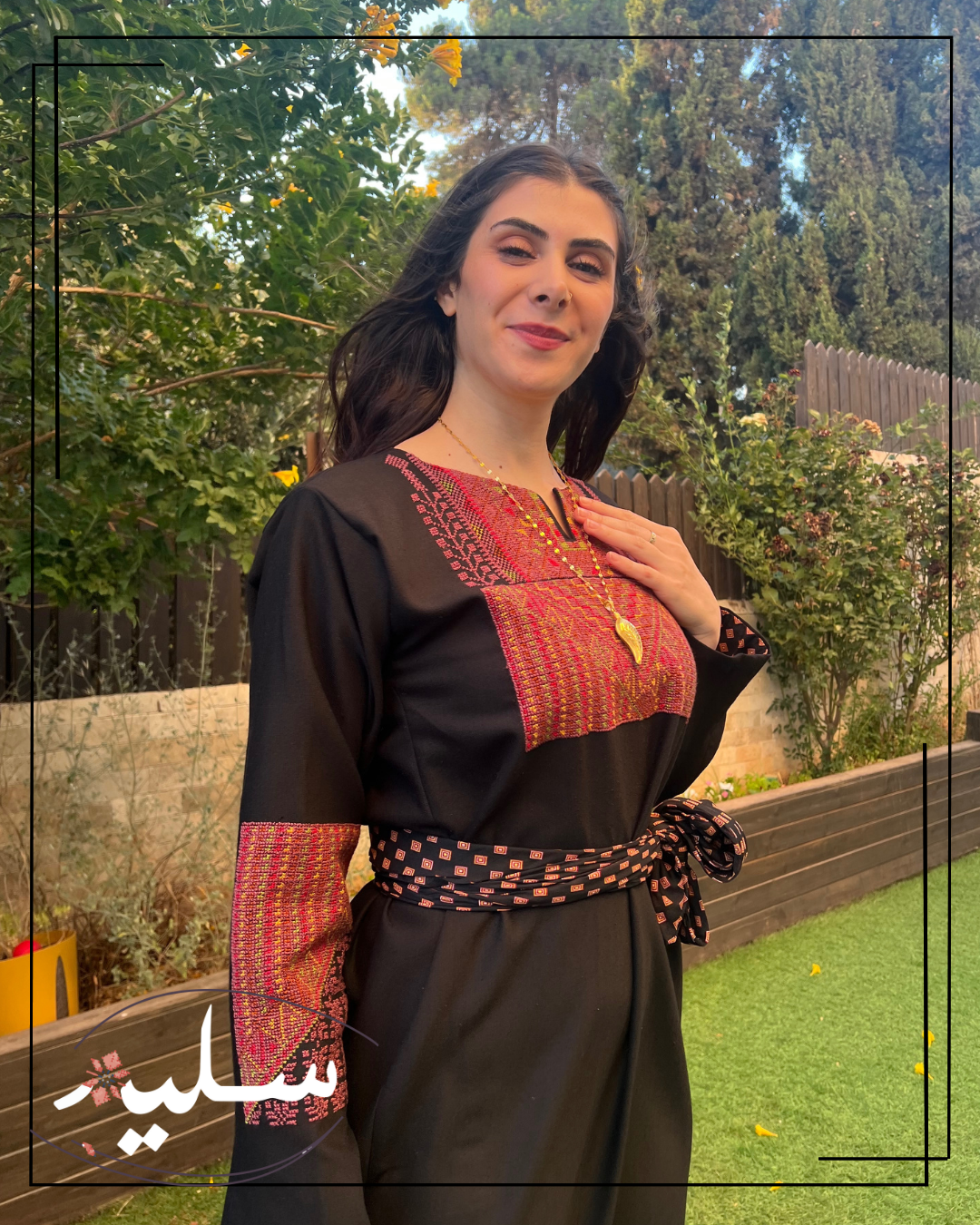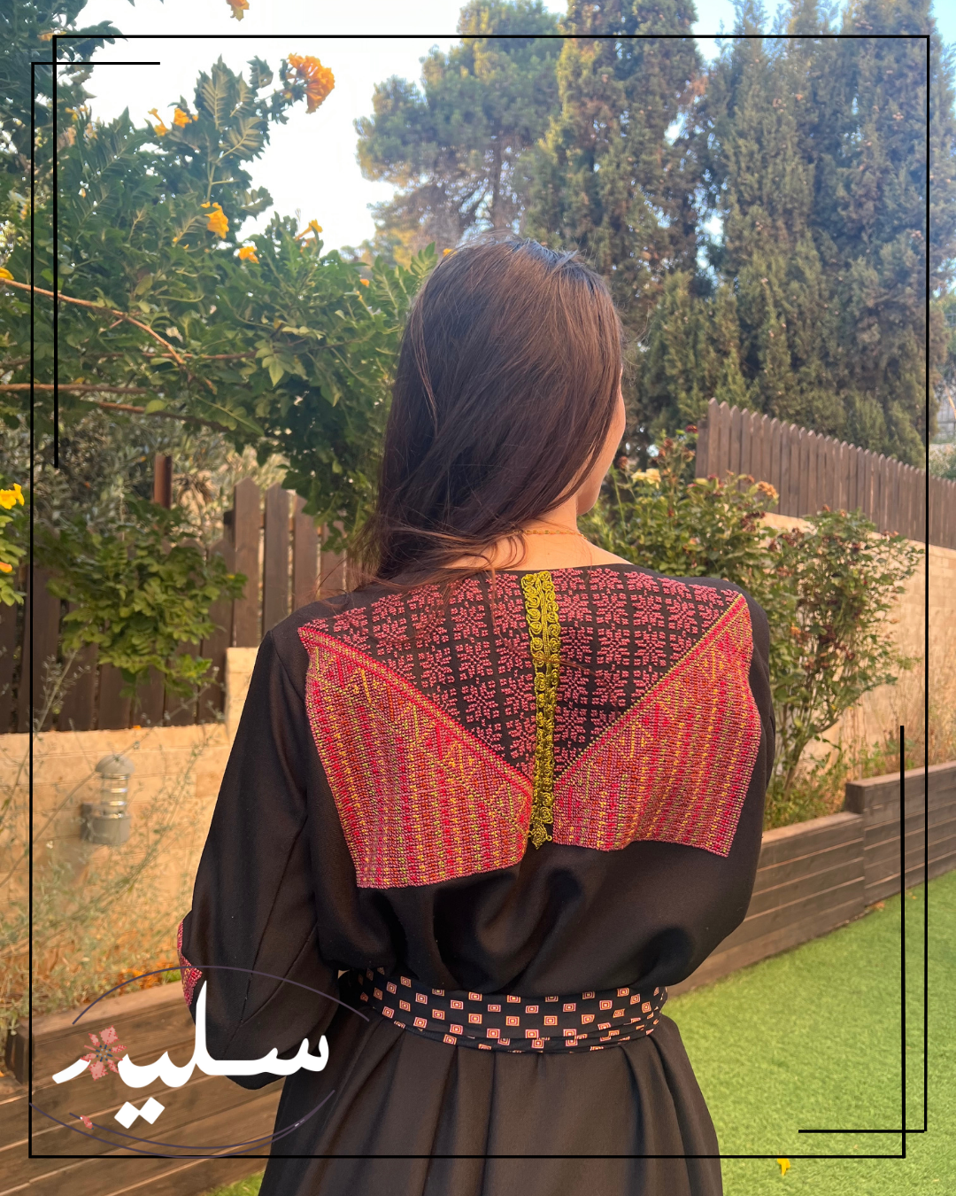 The embroidery is crafted with traditional linear patterns, arranged in harmonious rows. Designed with a modern silhouette, the dress features soft pleats at the front and back, adding graceful movement, structure and style. The sides are adorned with a traditional embroidered panel that beautifully complements the detailing on the neckline, sleeves, and back. A matching heritage-inspired belt enhances the overall look, tying together the embroidery’s tones. Tailored to comfortably fit medium to larger sizes, this dress is a timeless blend of cultural authenticity and contemporary elegance.